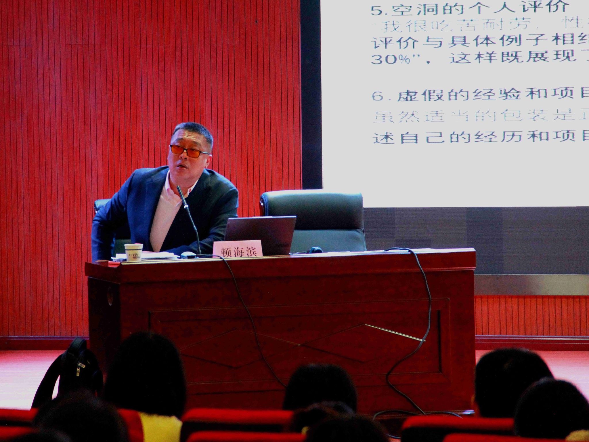 讲座中,顿海滨首先分析了当前毕业生就业形势,指出面临严峻的就业现实,毕业生要树立正确的择业观念,做最充分的准备,积极寻求就业机会。他重点分享了简历制作、投递等的注意事项,对HR一眼就会拒绝的简历问题进行剖析和指导,指出实践经历是用人单位在简历中最为关注的内容,并手把手教同学们如何撰写自己的时间精力;此外,他还简要介绍了面试时的注意事项,以及学习使用AI等最新工具进行模拟面试、寻找高质量用人单位的方法等内容。