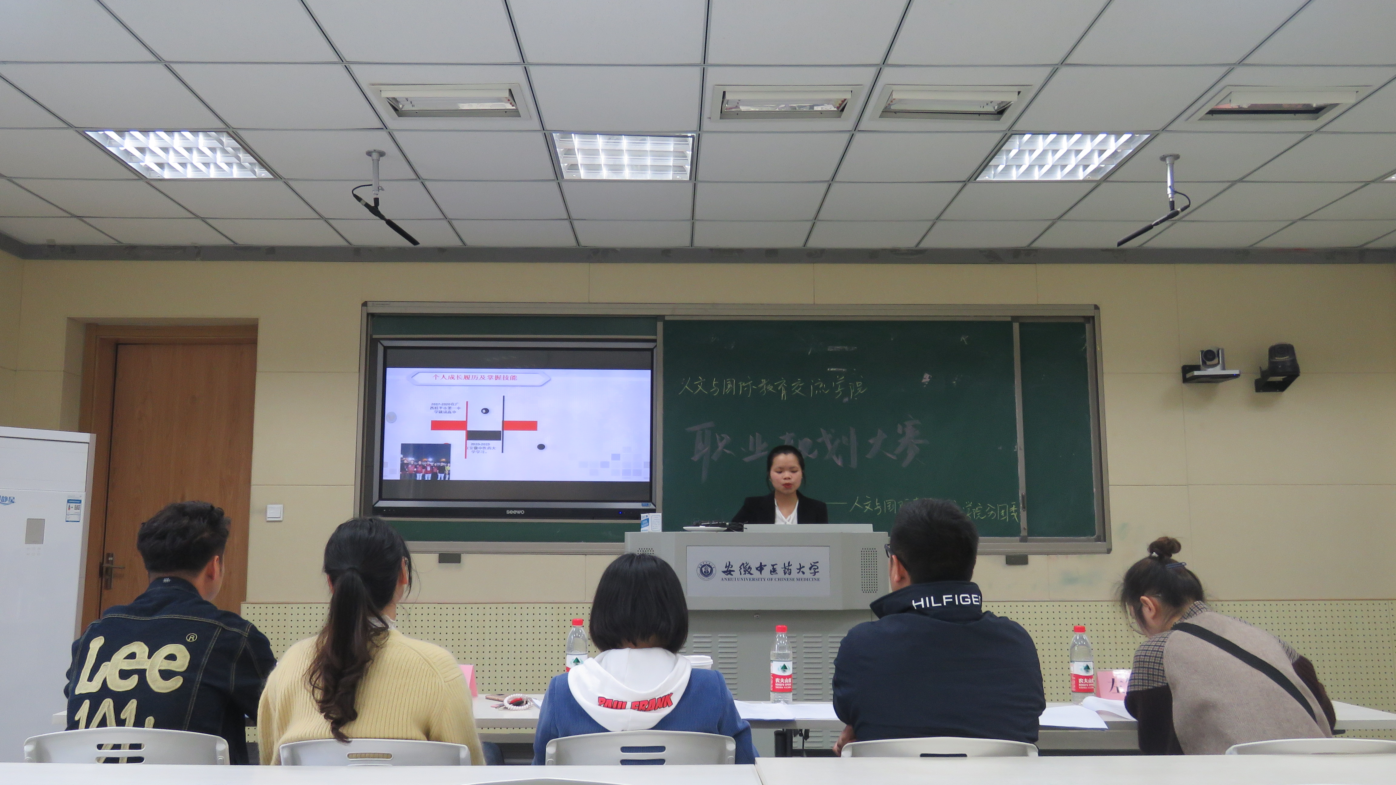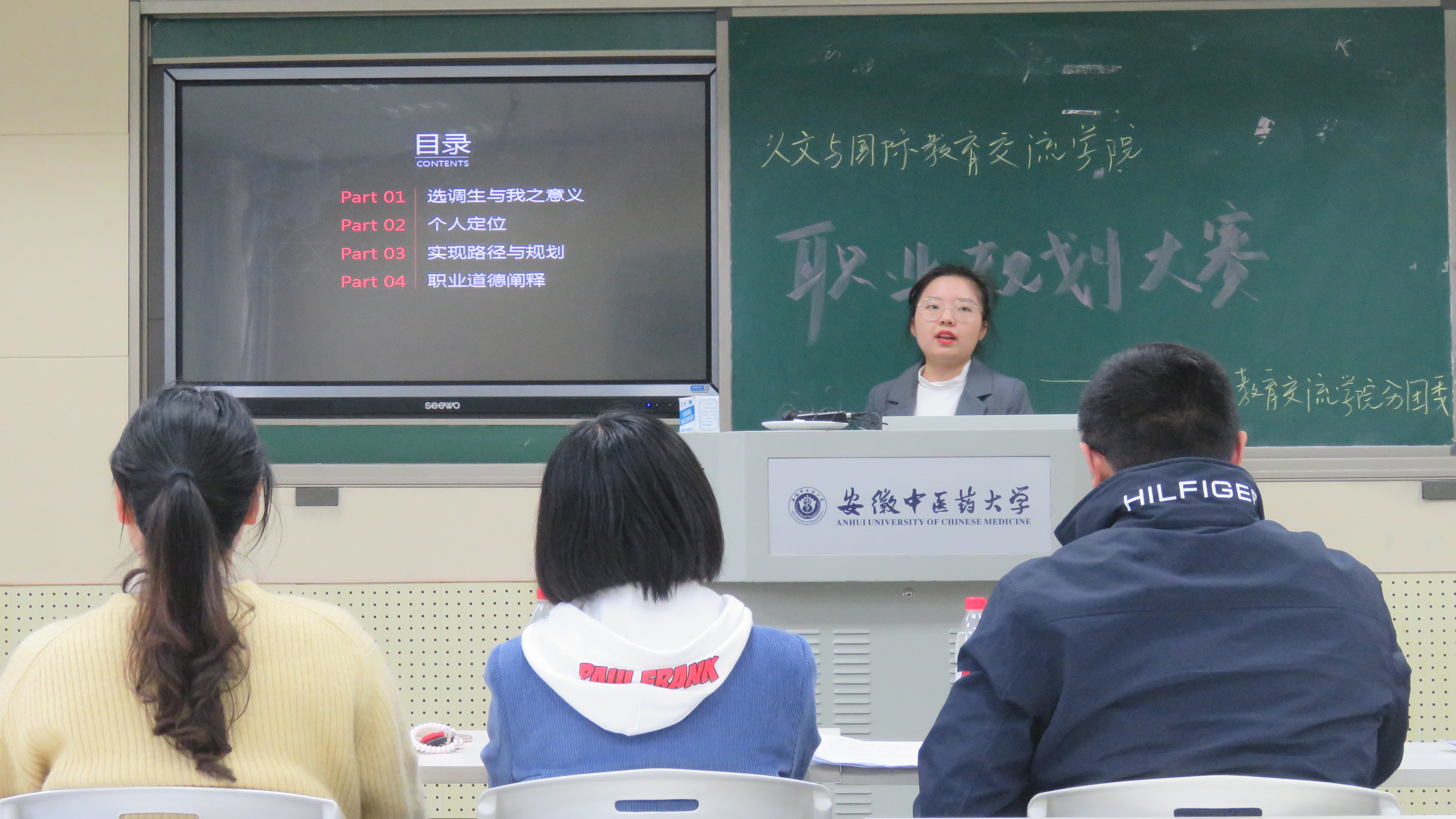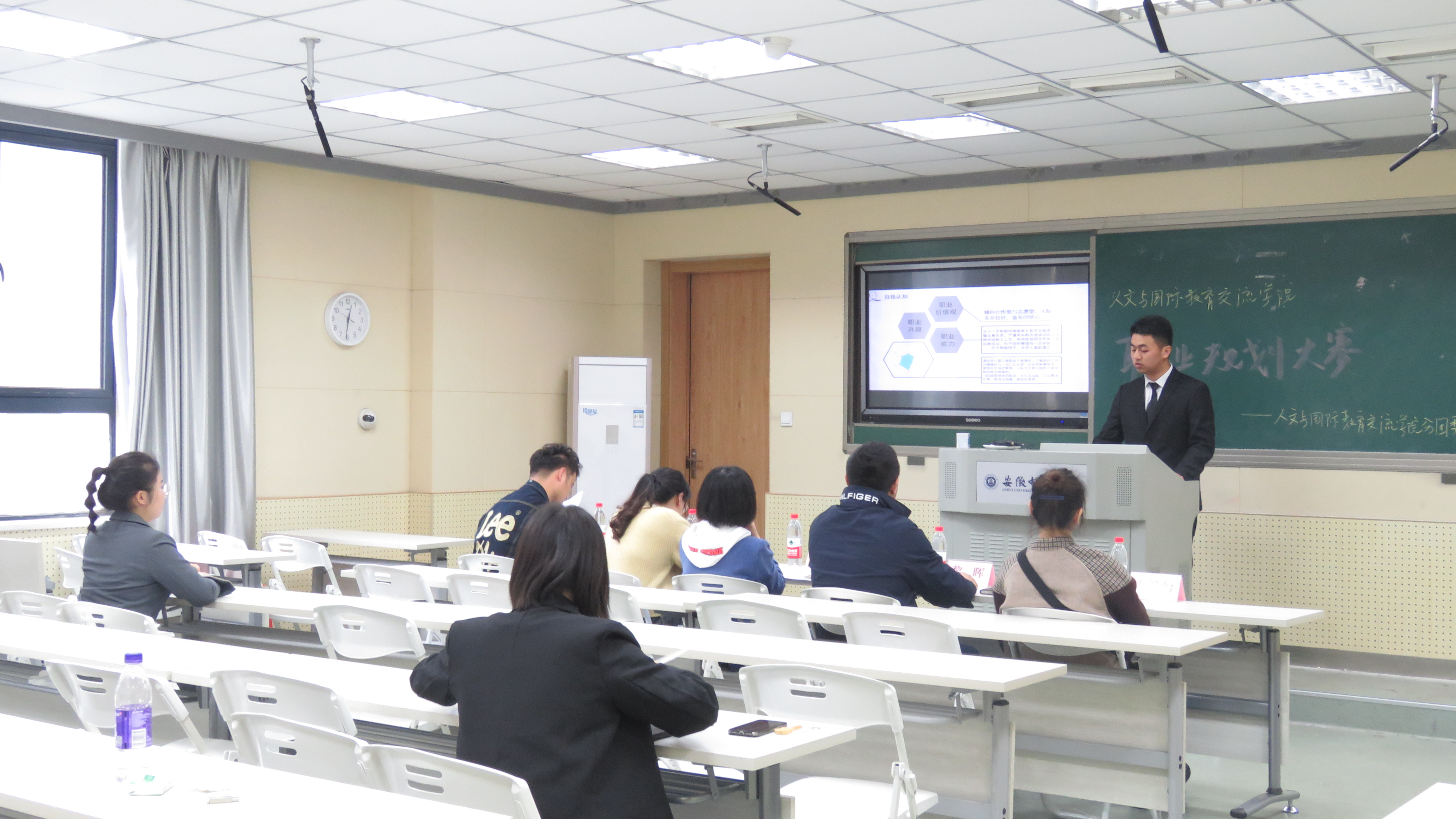 比赛分为现场汇报和答辩两个环节进行。汇报环节中,选手结合PPT演示文稿和职业规划发展的小视频短片,对自身和外部环境进行了系统、细致分析,详细地谈论了自己在就业方面的优势及劣势,以此提出了自己的职业目标、发展路径和行动规划。在现场答辩环节,评