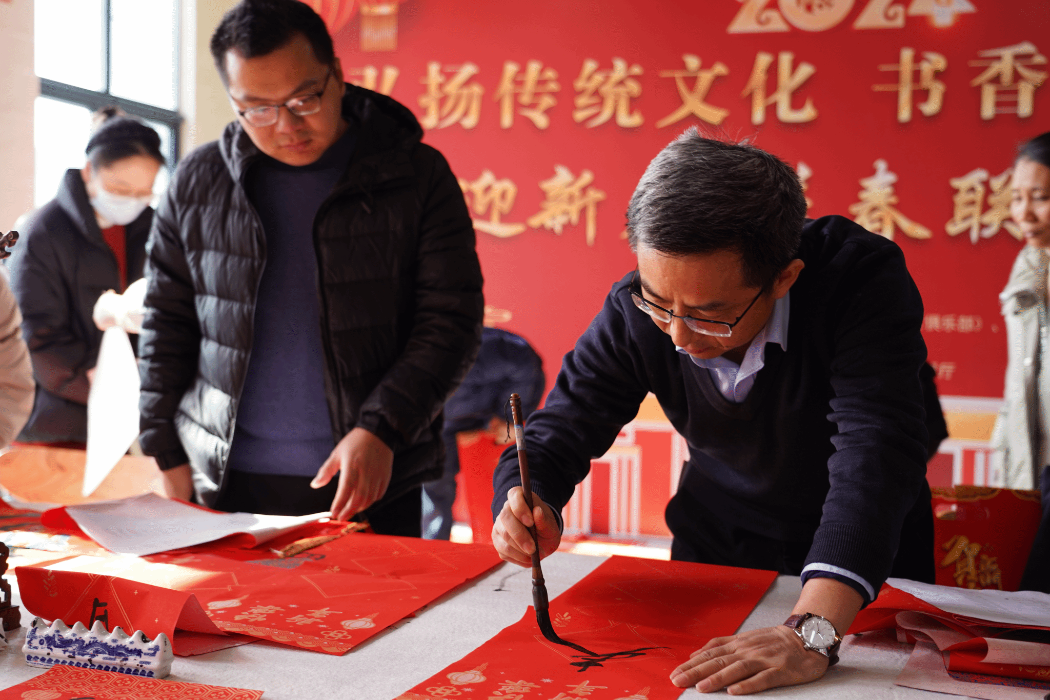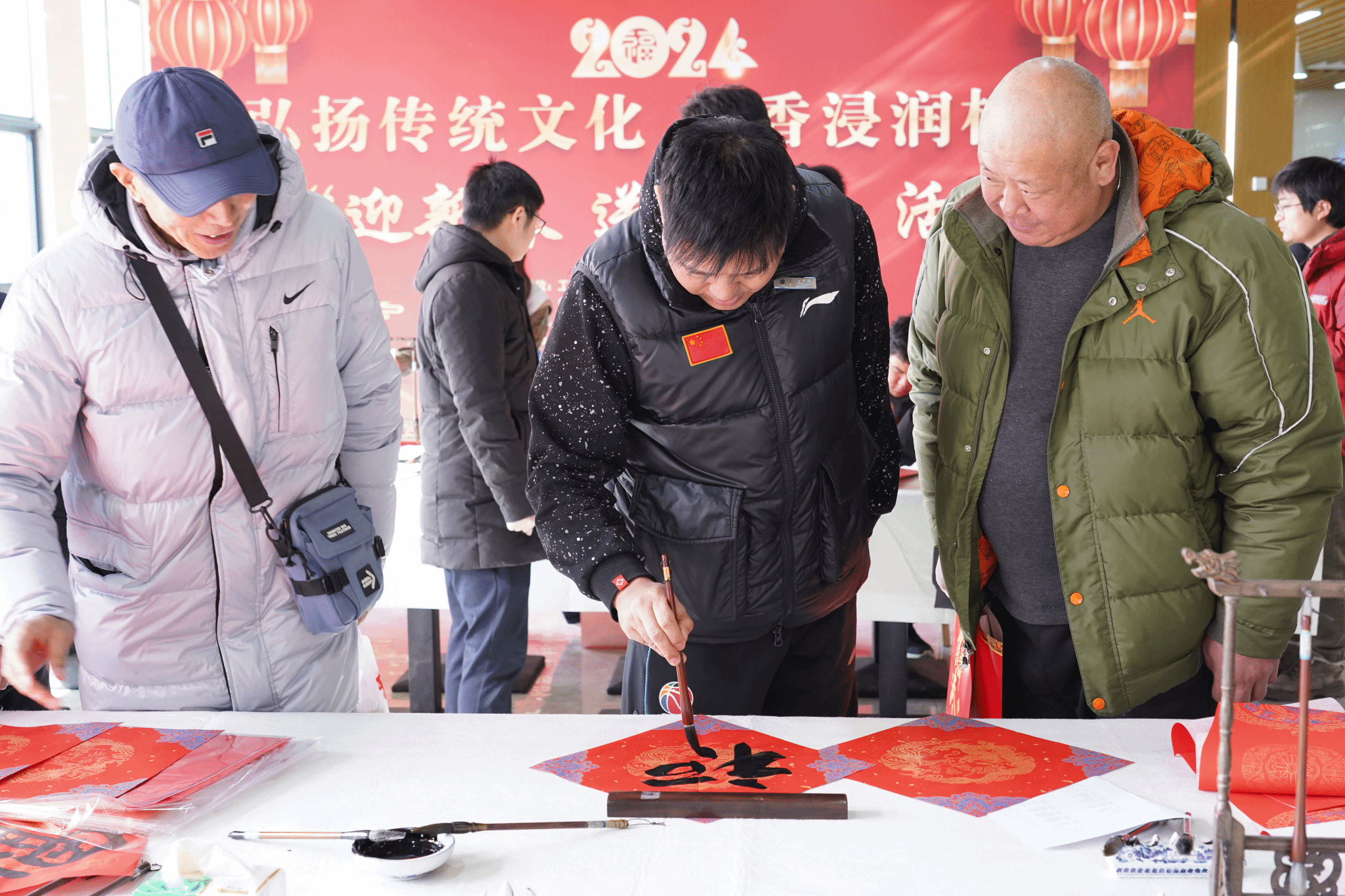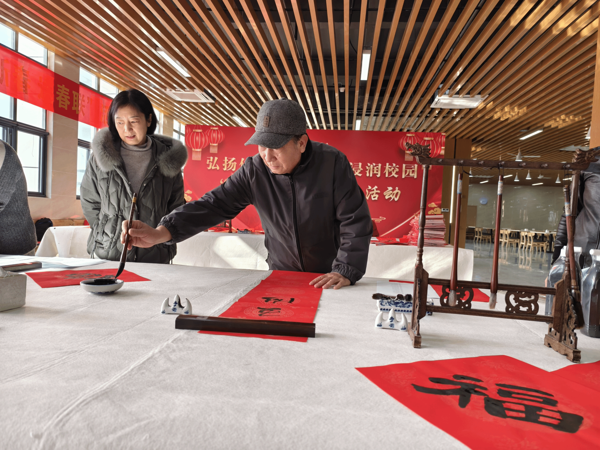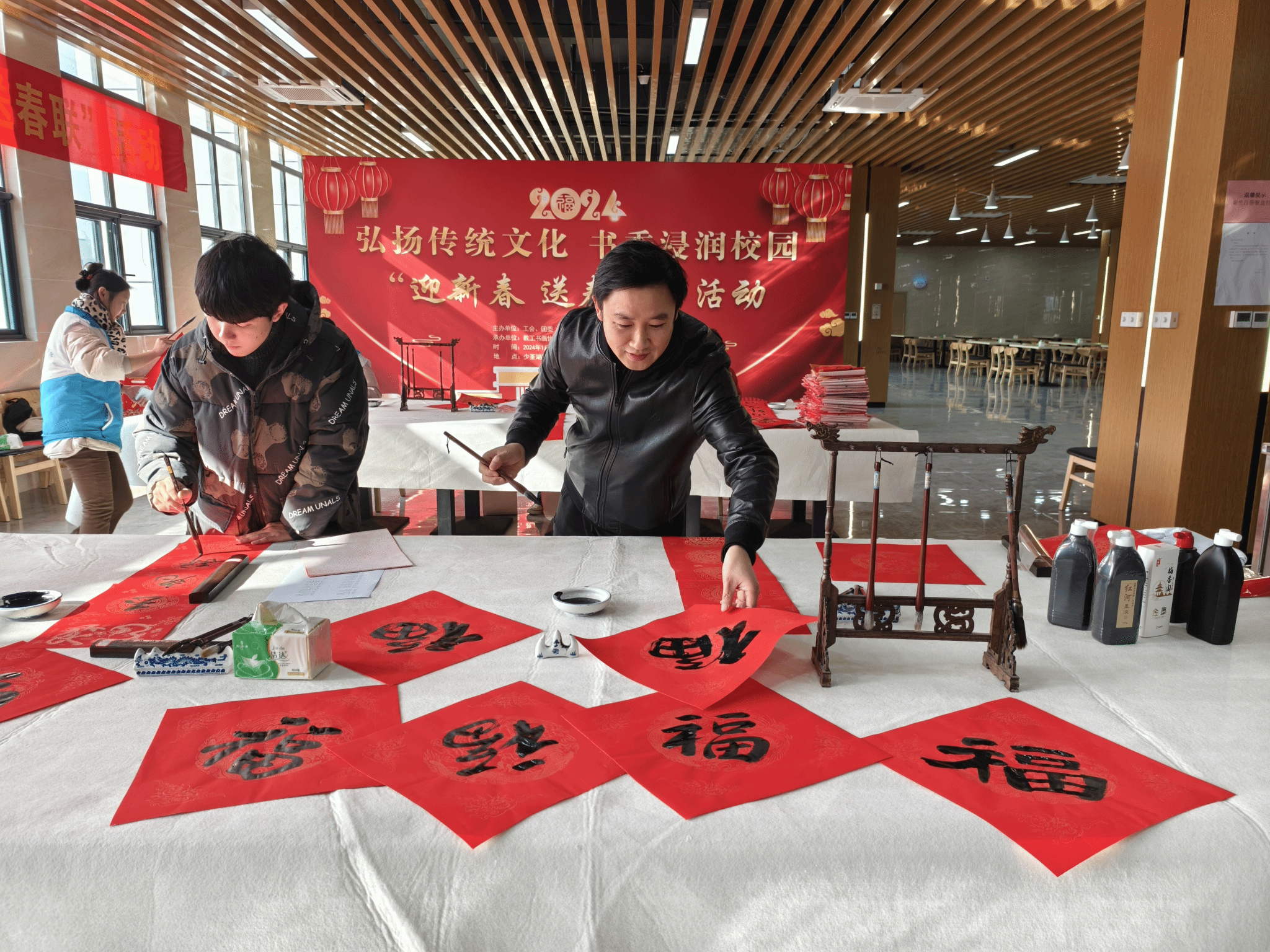 活动现场气氛热烈,人潮涌动。教职工书画协会的老师、老员工书画协会(俱乐部)的同学们为师生义务书写春联。一笔一划蕴含浓郁年味,一撇一捺尽是汉字韵味,一提一顿体现书写者的专注;在喜庆的红纸上书写了一幅又一幅春联佳作,既有辞旧迎新、迎祥纳福的祝福,也有蕴含中医药文化的中药名对联;浓浓的年味扑面而来,承载着祝福的春联和“福”字送到大家手中,现场其乐融融,喜悦之情溢于言表,师生一同感受来笔尖的温情与新年的喜悦。