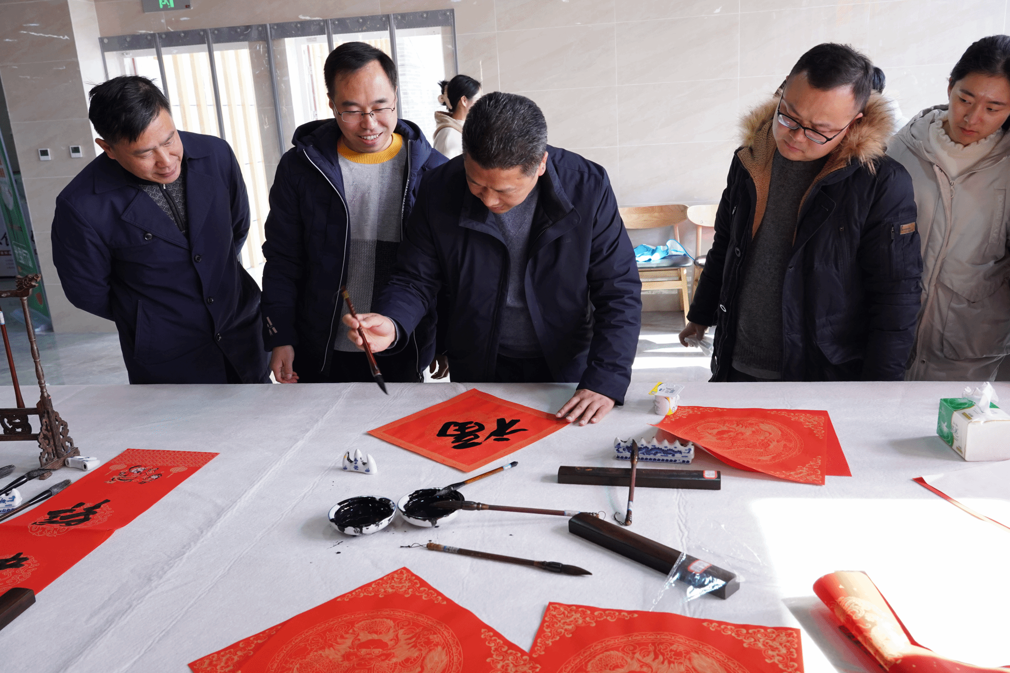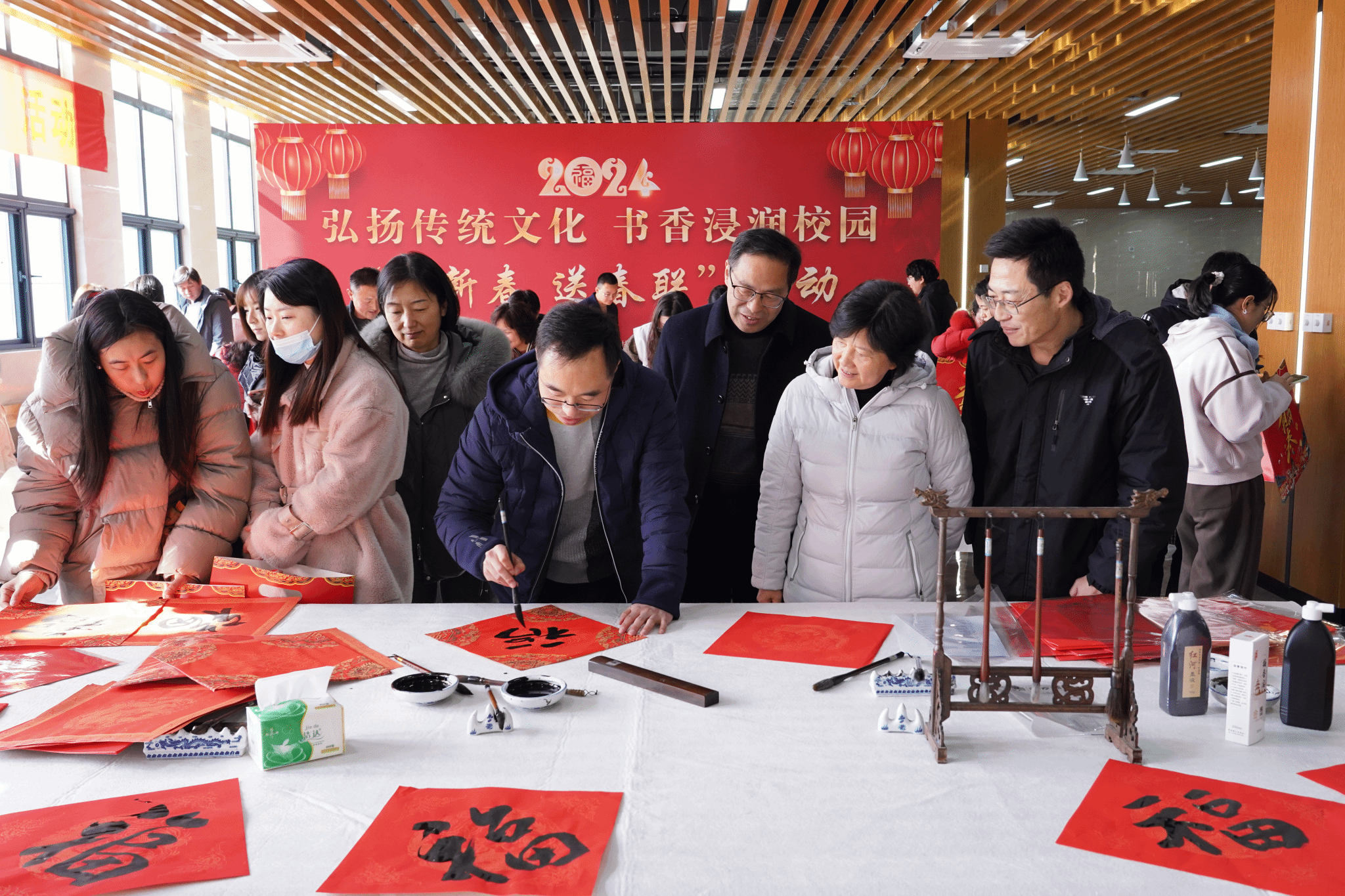 为深入学习贯彻习近平新时代中国特色社会主义思想,进一步弘扬中华优秀传统文化,加强公司美育工作,服务广大师生,喜迎2024年春节。1月12日中午,由校工会、团委主办,教工书画协会、老员工书画协会(俱乐部)、美育中心承办的弘扬传统文化 书香浸润校园——“迎新春 送春联”活动在少荃湖校区开展,师生欢聚一堂、挥毫泼墨。