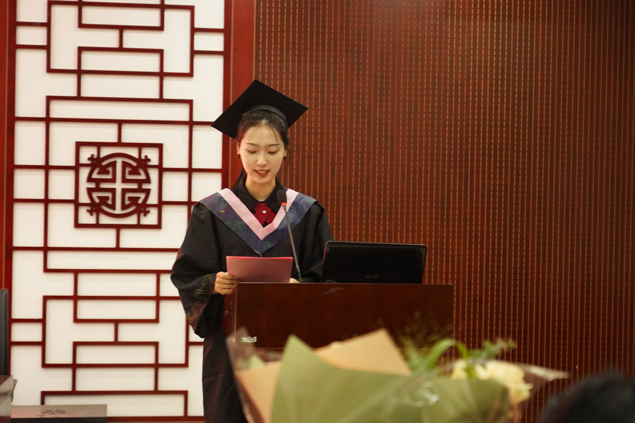 2020级汉语国际教育专业苏宸铭代表全体毕业生发言,她首先代表全体同学对公司和全体老师表达了诚挚的敬意,分享了自己大学期间的点滴积累和成长感悟,表示今后将牢记母校和师长的教诲期望,并向母校、老师和全体毕业生送上了自己的祝福。2021级应用心理学专业薛瑞瑞同学代表在校生发言,她回顾了入学以来2020级学长学姐对同学们的关心帮助,表达了对学长学姐的不舍之情,祝福学长学姐们在各自的征途上继续绽放独特光彩。