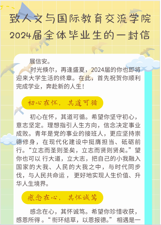 2024届毕业生即将踏上新的征途,奔赴星辰大海。为进一步教育引导毕业生深植爱校荣校情怀,营造健康、文明、和谐、有序、暖心的毕业离校氛围,号召广大毕业生为母校留下一个好印象,为学弟学妹留下一个好榜样,为自己留下一个好回忆。根据公司有关文件精神,自五月底以来,公司开展“心怀感恩,逐梦远航”2024届毕业生文明离校系列活动。具体如下。