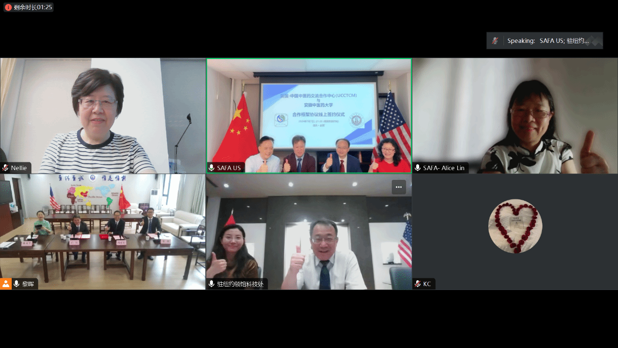 2024年7月8日,公司与美国-中国中医药交流合作中心在线上举行合作框架协议签约仪式。公司董事长许钒、美国-中国中医药交流合作中心董事长张锦平先生、中国驻纽约总领馆科技参赞侯立宏、中国驻纽约总领馆科技领事王赛歌、美国-中国中医药交流合作中心临床医疗总监李旭辉、世界中医药学会针灸学会联合会副主席 美国-中国中医药交流合作中心专家委员会共同主席林榕生、美国-中国中医药交流合作中心专家委员会执委哈佛大学医公司丹娜法博癌症中心主任包婷等参加签约仪式。公司外事办公室主任周亚东、副主任昂文平等一同参加签约仪式。