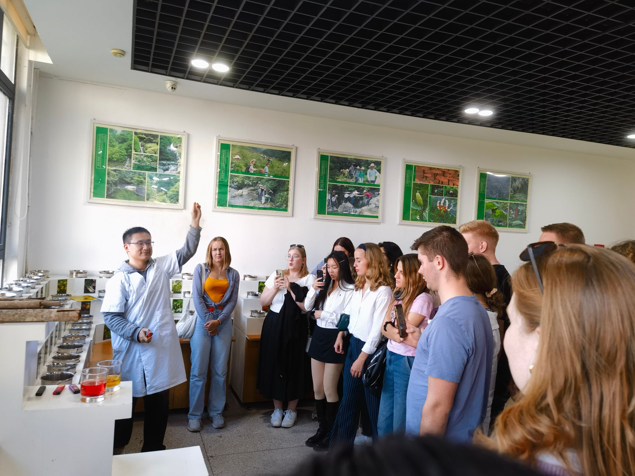 来访团首先参观了药公司中药资源中心,员工讲解团王浩宇同学向大家生动形象地讲解了各类中药的基本特性、简单的辨识方法及基本功效等内容,同时让德国员工近距离了解什么是中药材,以及中药是如何治疗疾病。