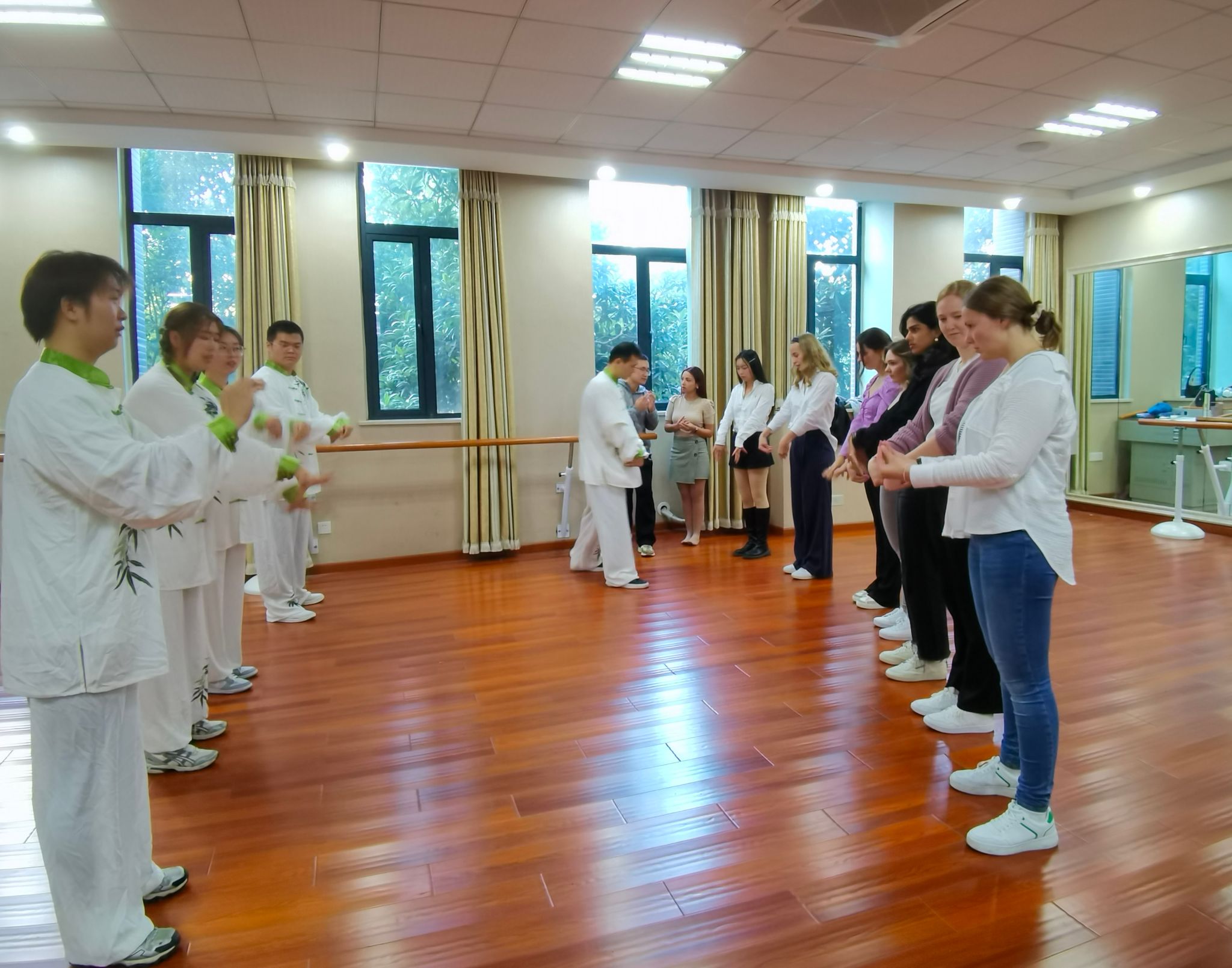 在针灸推拿公司,副经理吴子建及华佗养生堂的员工团队接待了来访团一行。针灸推拿公司五禽戏队的员工代表向外籍员工展演了五禽戏,并教授了他们“虎、鹿、熊、猿、鸟”中最具代表性的动作,讲解了五禽对应相关的脏腑,并讲解了所有的养生保健功能,让德国员工更深刻地体会了中医药传统功法的魅力。