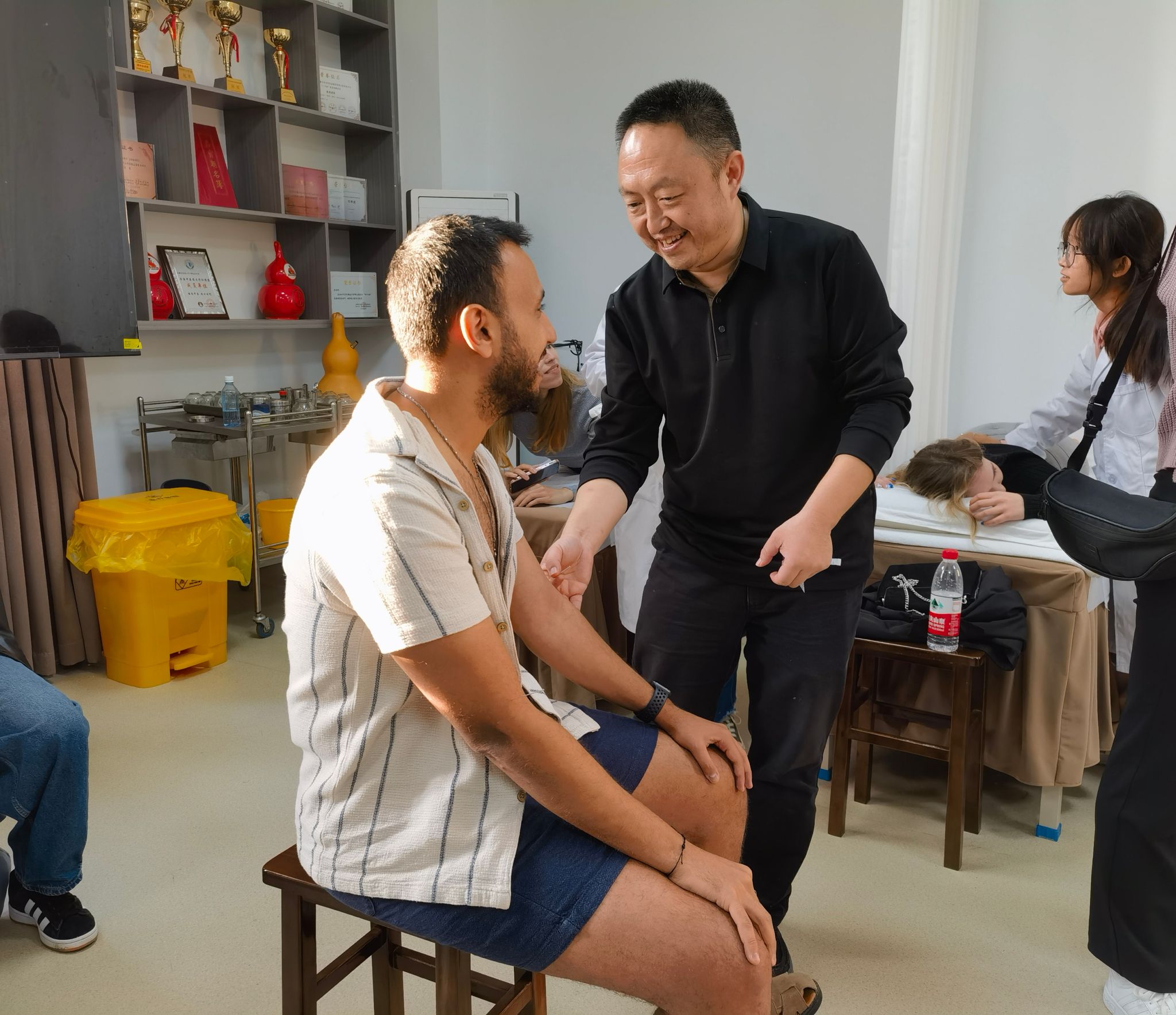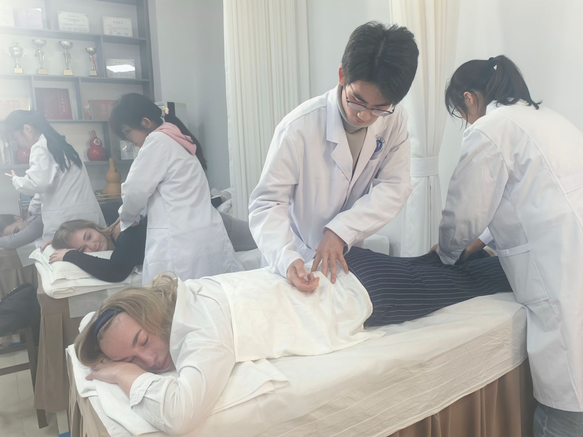 随后来访团同学们沉浸式体验了针灸、推拿、艾灸等中医特色疗法,吴子建带领华佗养生堂的员工团队为德国员工进行治疗体验。养生堂的员工充分发挥自身专业特长,为职工提供专业的推拿、针灸、拔罐、艾灸等服务。大家对这些手段能够迅速缓解各种不适症状赞不绝口,深刻感受到中医疗法的神奇和博大精深。