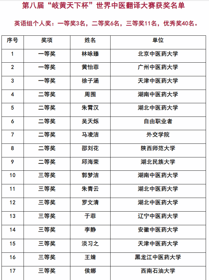 为进一步弘扬中华优秀传统文化,推进中医药走向国际,提高中医药对外传播的质量及翻译水平,10月31日,由世界中医药学会联合会主办,翻译专委会等承办的第八届“岐黄天下杯”世界中医翻译大赛落下帷幕。此次大赛共有来自135个国内外院校和自由译者参加,收到有效参赛译文1072篇,终评专家委员会最终确定个人奖、团体奖以及优秀指导教师奖,其中英语组个人奖评选出一等奖3名,二等奖6名,三等奖11名,优秀奖40名。
