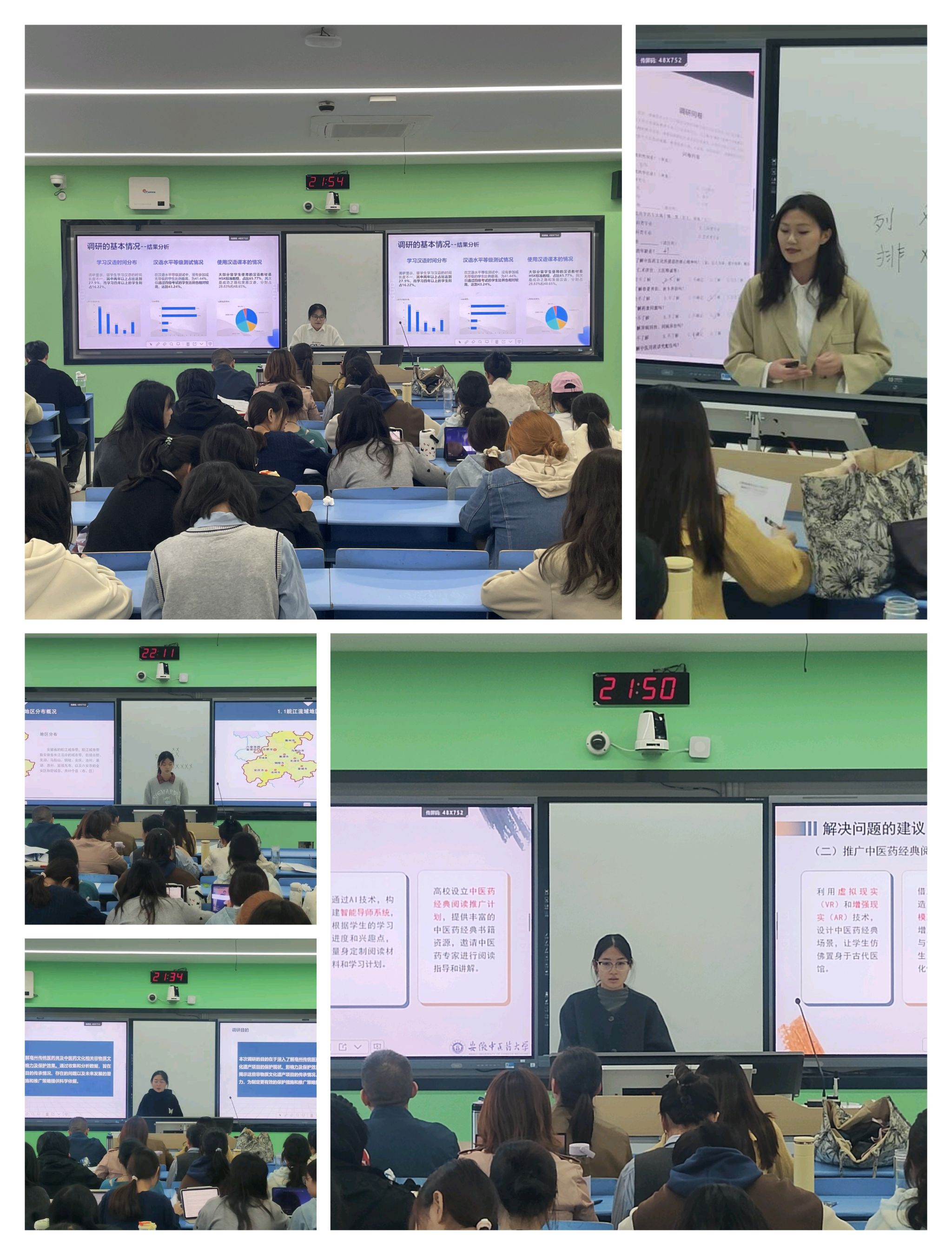 为做好此次实践学习工作,汉语国际教育系精心组织、周密部署,系全体专职教师参与了此次实践活动。员工共分为10组,每组在教师的指导下认真商讨制定调查问卷、通过线上(问卷星、微博等)线下(实地走访)相结合的方式实施调研,根据收回的调查问卷撰写调研报告。10月30日,2021级汉语国际教育专业的同学们在公共教学楼B227教室进行2024年暑期小学期实践调研成果汇报。