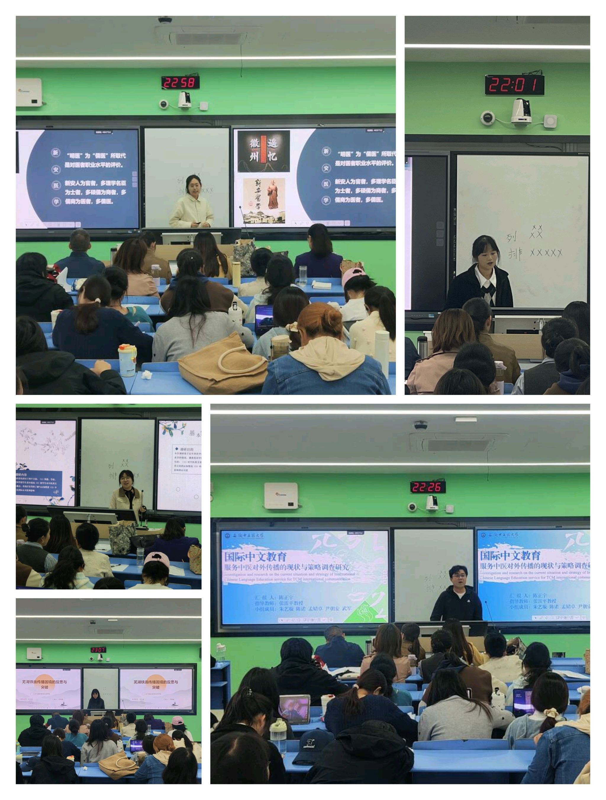 10组同学在教师的指导下分别开展面向汉语方言、职工汉语习得、新安明医、芜湖铁画等传统文化保护和传承等方面的深度探析,有效开展国际中文教育服务中医药对外传播、中医药文化的了解、认知、认同度的调查研究,体现了中文与中医药的深度融合,具有创新性和现实意义,有效助力汉语国际教育安徽省一流专业建设。