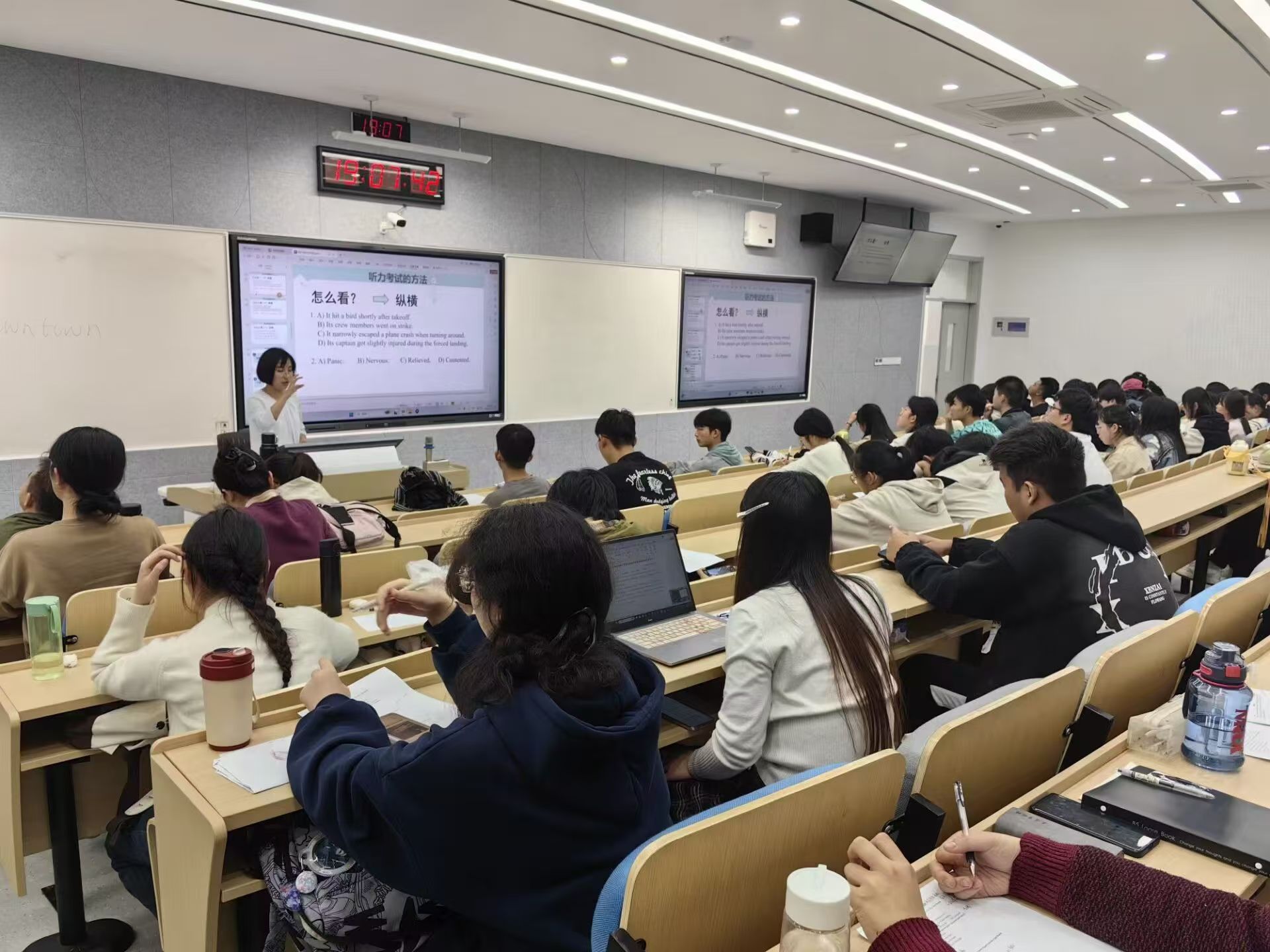 首场讲座“大学英语四六级听力考试策略与技巧”于11月15日晚在智慧教室B122-123举行,由王玉老师主讲。讲座从听力命题特征入手,深入分析高频场景与关键词辨识技巧,并结合典型试题讲解信息提取与逻辑推理策略。内容逻辑缜密,方法实用性强,为员工提供了高效备考的理论框架与实践路径。讲座现场员工们认真聆听,反响热烈。