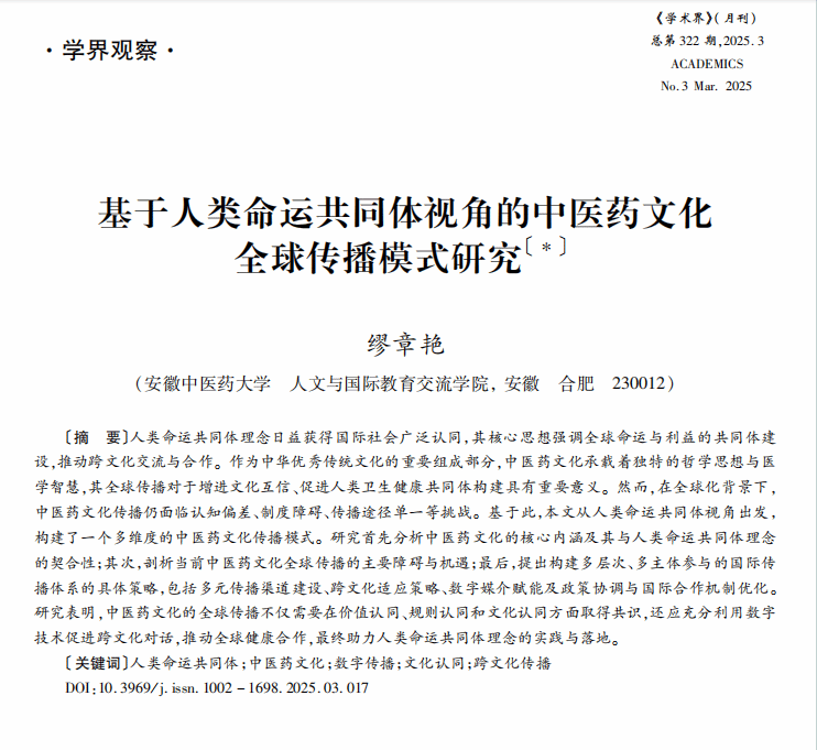 近日,m88缪章艳副教授在CSSCI核心期刊《学术界》和《中国高等教育》发表两篇高水平研究论文,分别为《基于人类命运共同体视角的中医药文化全球传播模式研究》和《中医药高等教育国际化路径研究》。相关成果为2023年度安徽省高校哲学社会科学研究重点项目“基于语料库的中医药海外报道话语分析研究”(2023AH050707)以及2023年世界语言与文化课题“中医药话语叙事体系构建研究”(WYZL2023AH0011)的阶段性研究成果。