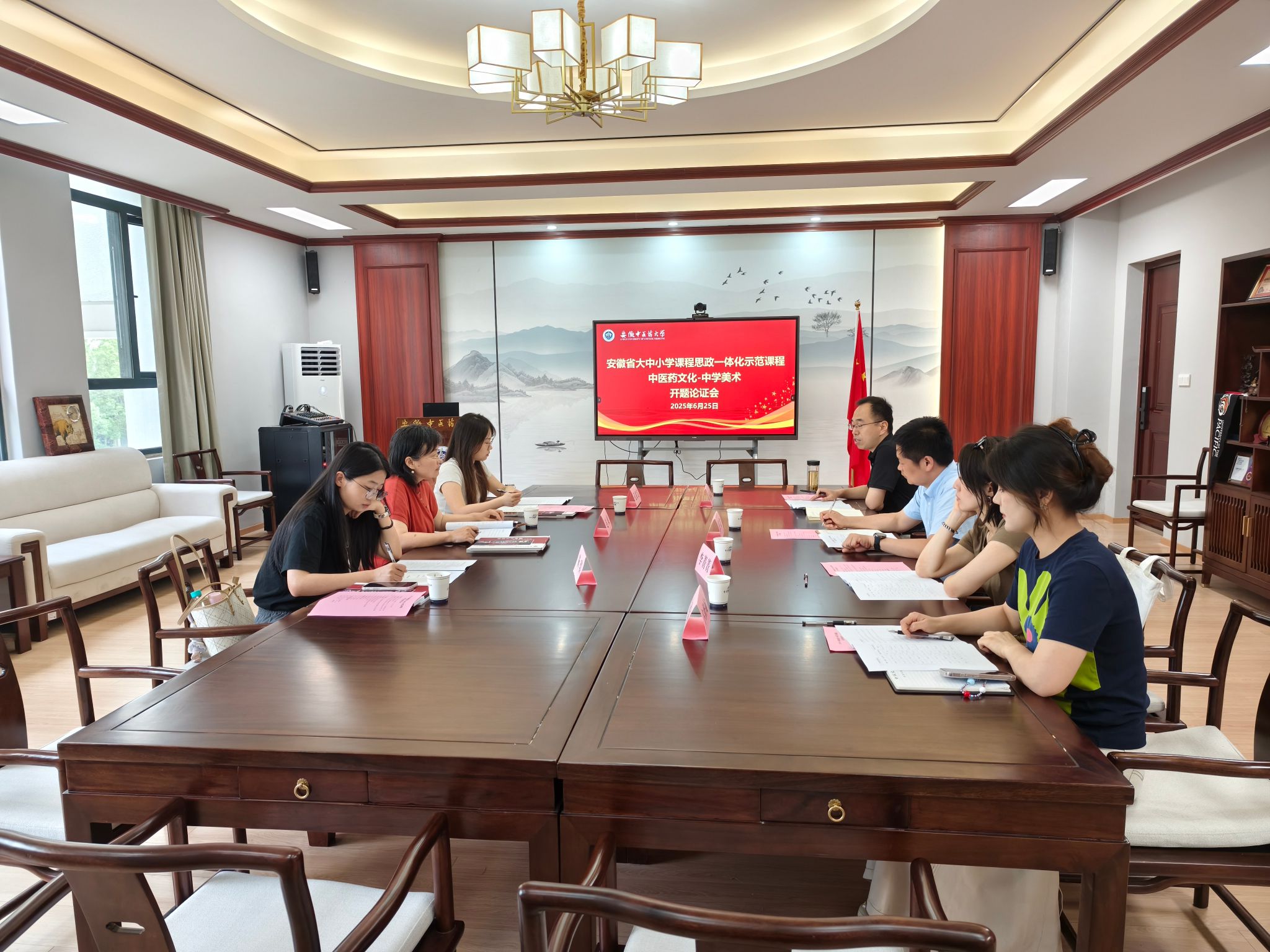 6月25日上午,公司召开“安徽省大中小学课程思政一体化示范课程项目《中医药文化-中学美术》(2024dzxkc037)”开题论证会。会议由副经理张筱荣主持,合肥市第四十六中学美育教研团队中学一级教师赵敏,中学二级教师靳琪、孔婧雯,公司美育中心主任李菁菁、秘书卞修婉、副教授杨硕鹏共同参与,围绕课程建设目标、实施路径及协同机制展开深入研讨。