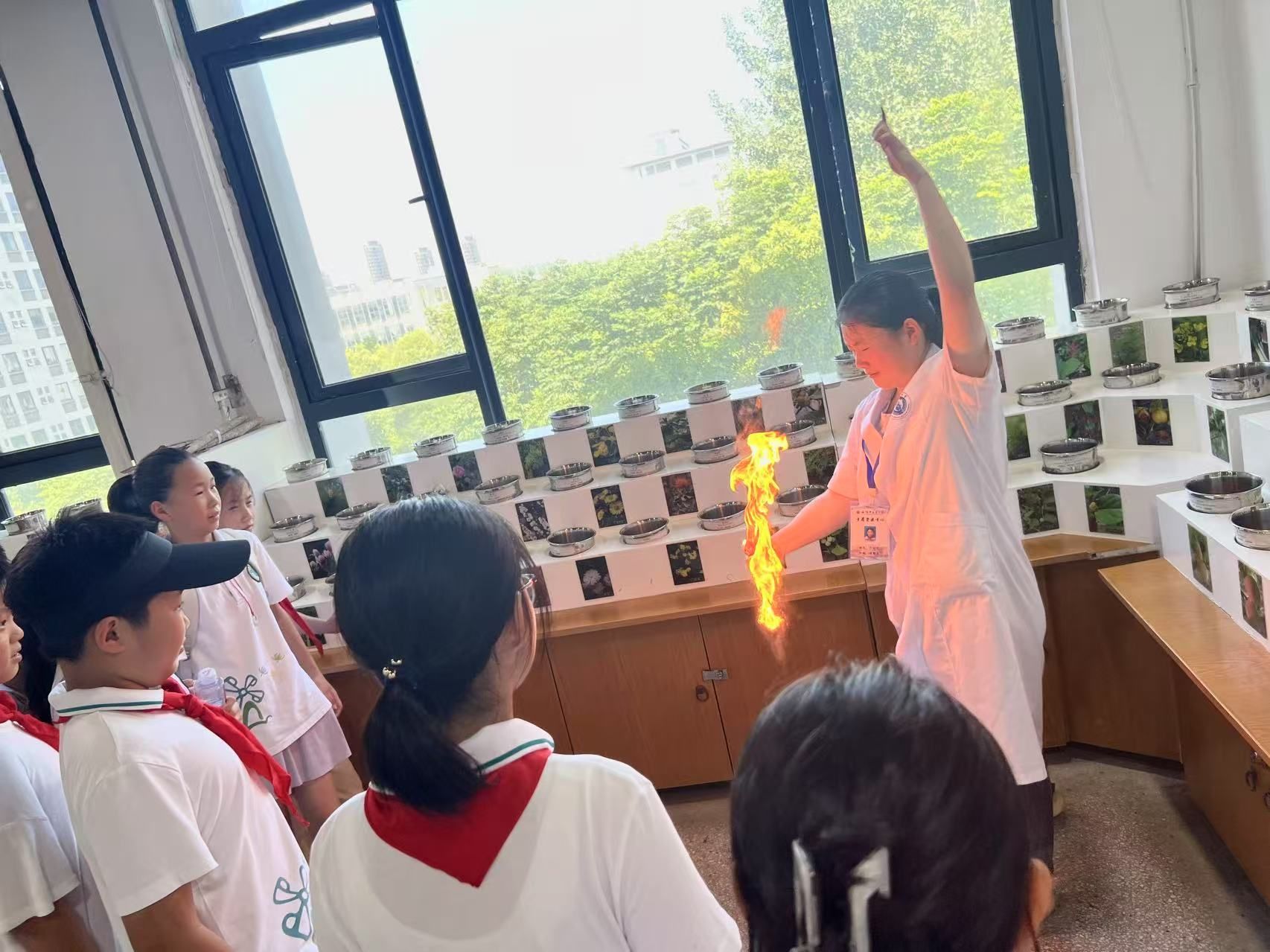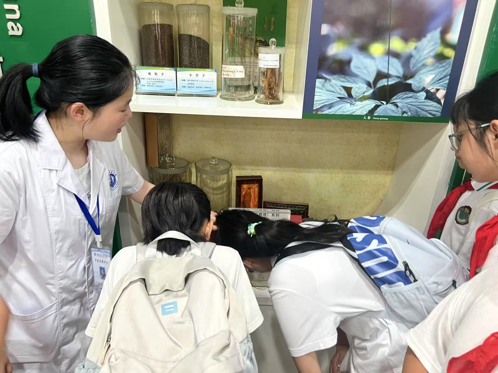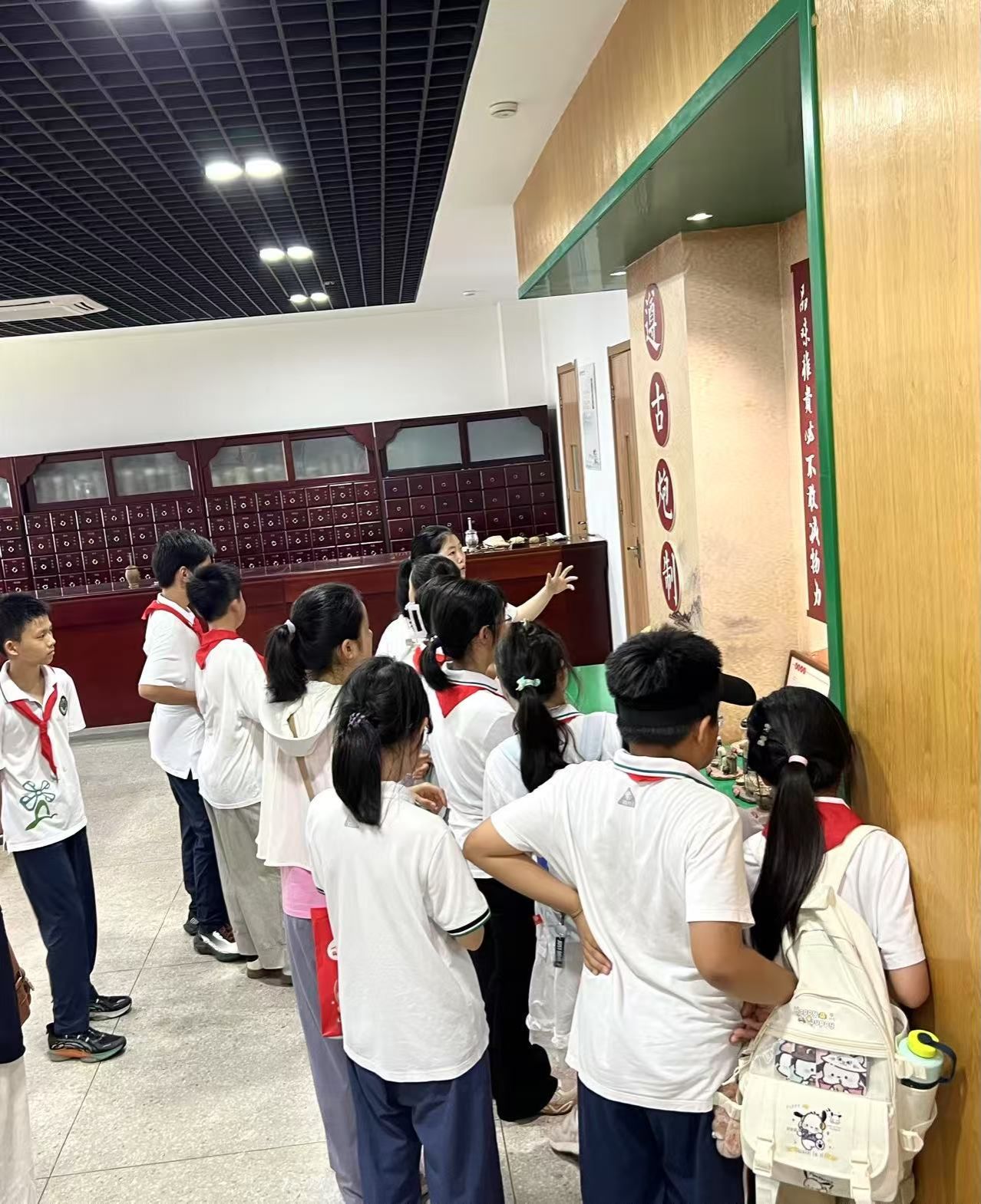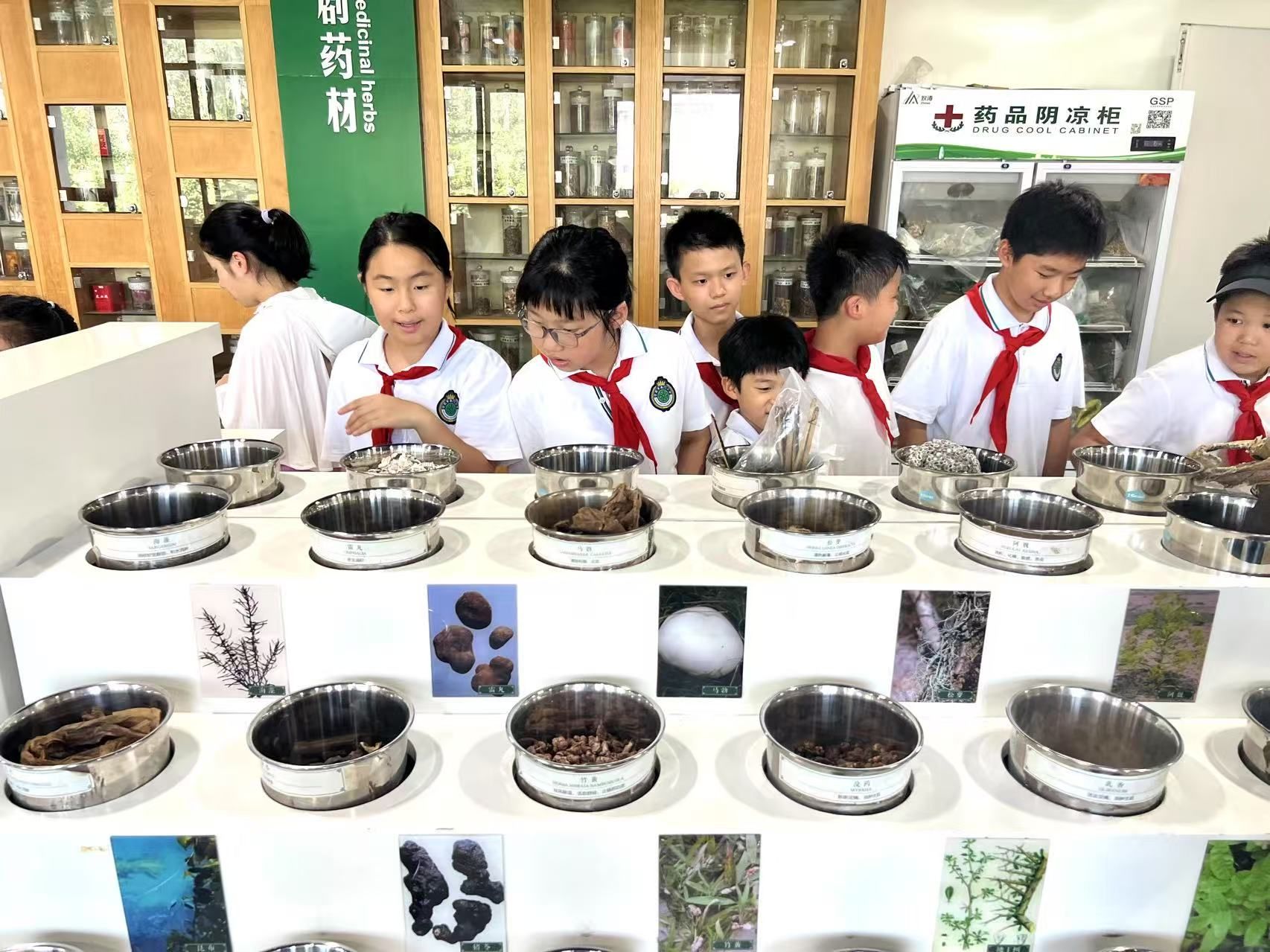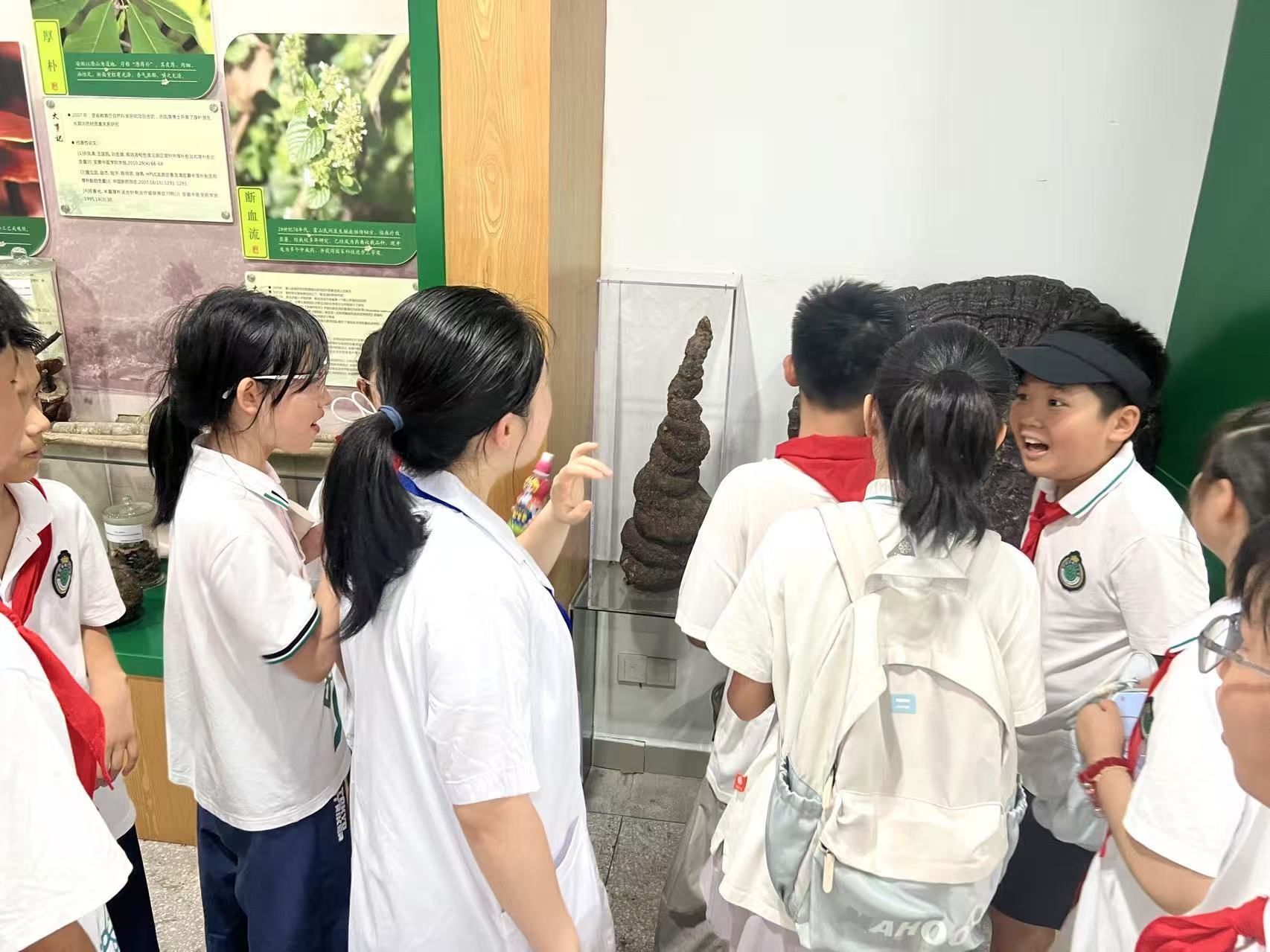 紧接着,同学们步入安徽道地药材研展馆。这里集中展示了以“滁菊”、“宣木瓜”等为代表的安徽特色道地药材。讲解员详细讲解了这些药材独特的生长环境、辨识特征及其在中医药宝库中的重要地位。孩子们听得全神贯注,对家乡丰富的中药宝藏感到无比自豪,深刻体会到大自然的神奇馈赠和古人的实践智慧。