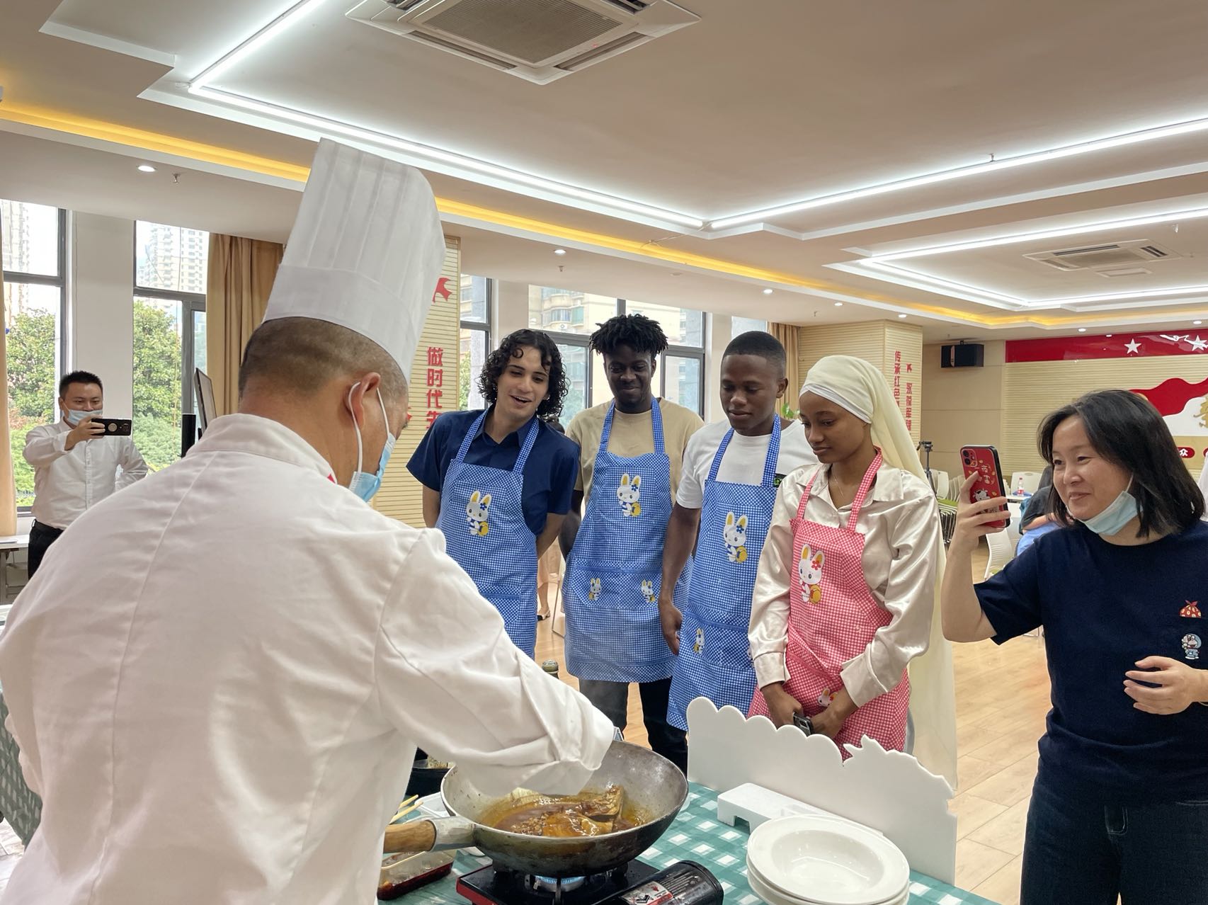 来自天鹅湖大酒店的主厨胡建东带领两位徽派大师,展示了高水平的徽菜文化,制作了黄山臭鳜鱼,焗鳕鱼,茄汁雪花牛等各式徽派美食,分发给活动参与者品尝。活动还特别安排了“跟着大厨学做徽菜”互动节目,几位职工“披挂上阵”,在大师的指点下,亲手制作菜品,学习徽菜文化,体验烹饪的乐趣。
