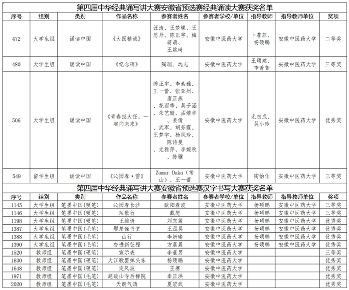 根据“关于第四届中华经典诵写讲大赛安徽省预选赛获奖名单的公示”整理