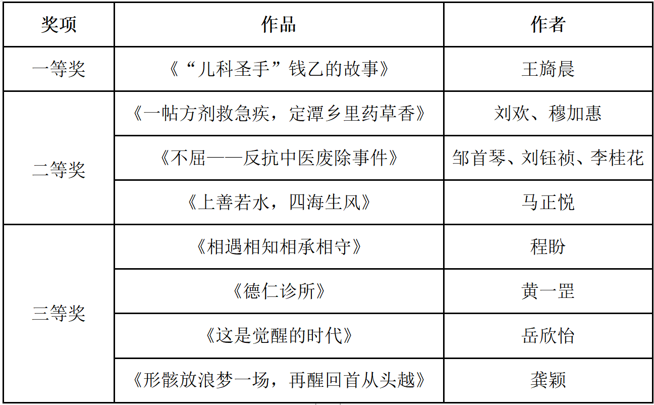 参赛作品主题鲜明,内容丰富,积极向上,不仅刻画了古代医学大家华佗、张仲景、钱乙、李时珍等人悬壶济世的生动形象,更展现了地方特色医学流派新安医学的名家辈出:温病大家叶天士读书万卷,仁术济民;程钟龄医门八法,影响后世;徐春甫宅仁医会,传承岐黄;张一帖医术精湛,代有人出,还描绘了近现代仁人志士守护中医传承的事迹,再现了中医药发展的不平凡历程。千年中医药,今朝风日好,参赛作品充分展示了新时代中医药学子热爱中医,传承中医的坚定信念,经专家评选,《“儿科圣手”钱乙的故事》荣获一等奖,《一帖方剂救急疾,定潭乡里药草香》等作品分获二、三等奖。