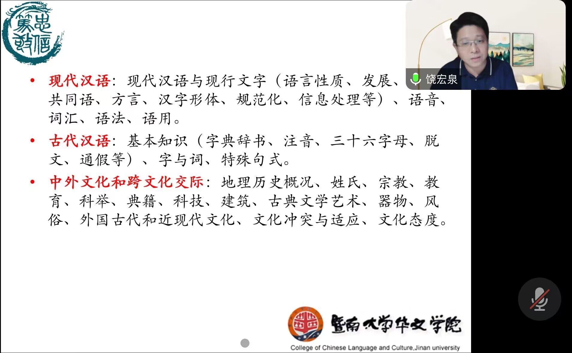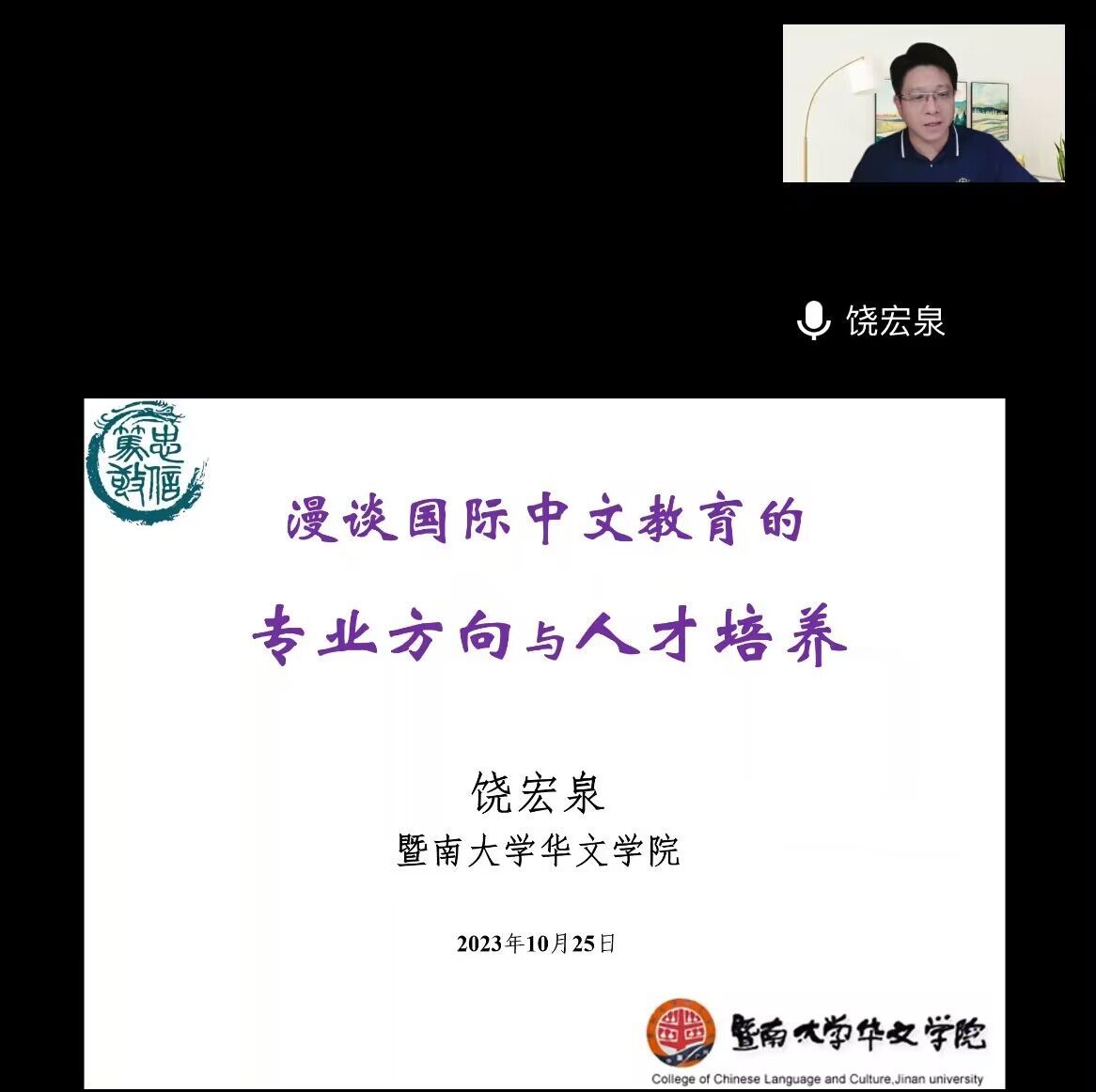 为帮助汉语国际教育专业员工巩固专业思想,加强学业指导,明晰考研形势,明确考研目标。近日,m88邀请暨南大学华文公司饶宏泉教授作题为《漫谈国际中文教育的专业方向与人才培养》的线上专题讲座。公司党总支书记金晓琴、党总支副书记彭青和、全体辅导员和大一、大二、大三年级汉语国际教育专业同学参加活动。讲座由金晓琴主持。