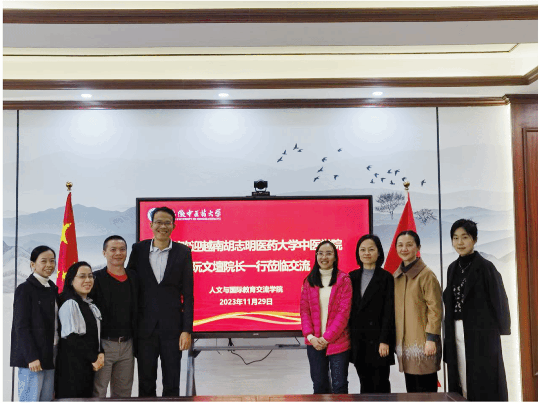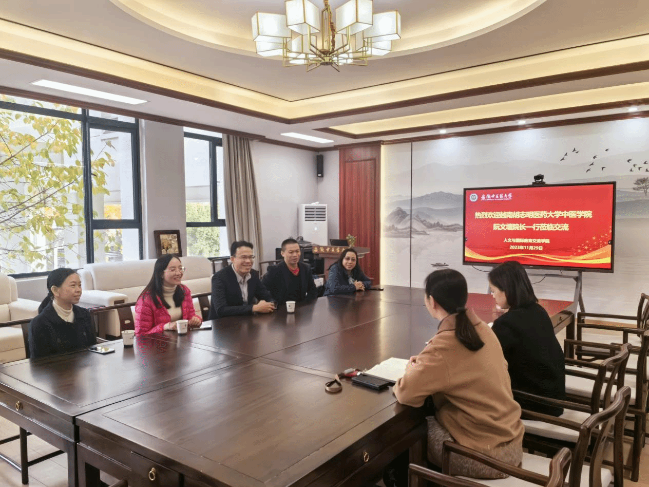 2023年11月29日, 越南胡志明市医药大学传统医公司NGUYEN VAN DAN (阮文檀)经理、第三附属医院执行经理KIEU XUAN THY(乔春诗)等一行5人来访,公司党总支书记金晓琴、分管外事工作副经理昂文平及相关科室负责人员参加了会谈。
