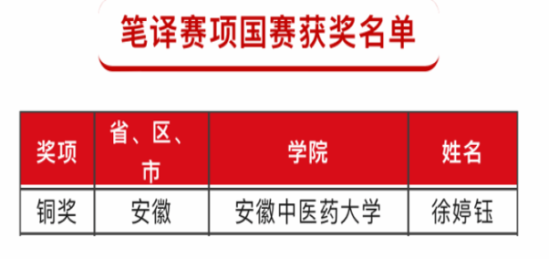 12月5日,2023“外研社·国才杯”“理解当代中国”全国老员工外语能力大赛英语组国赛各分赛项圆满落幕。2021级汉语国际教育专业陈正宇同学(指导教师:陈薇薇、潘银星、杨丽莉)以出色表现斩获全国总决赛银奖;中医公司2022级中医学专业徐婷钰同学(指导教师:张翠进、采宇、李静)以扎实的语言功底斩获笔译组铜奖,实现公司在该项赛事中的两大历史性突破。