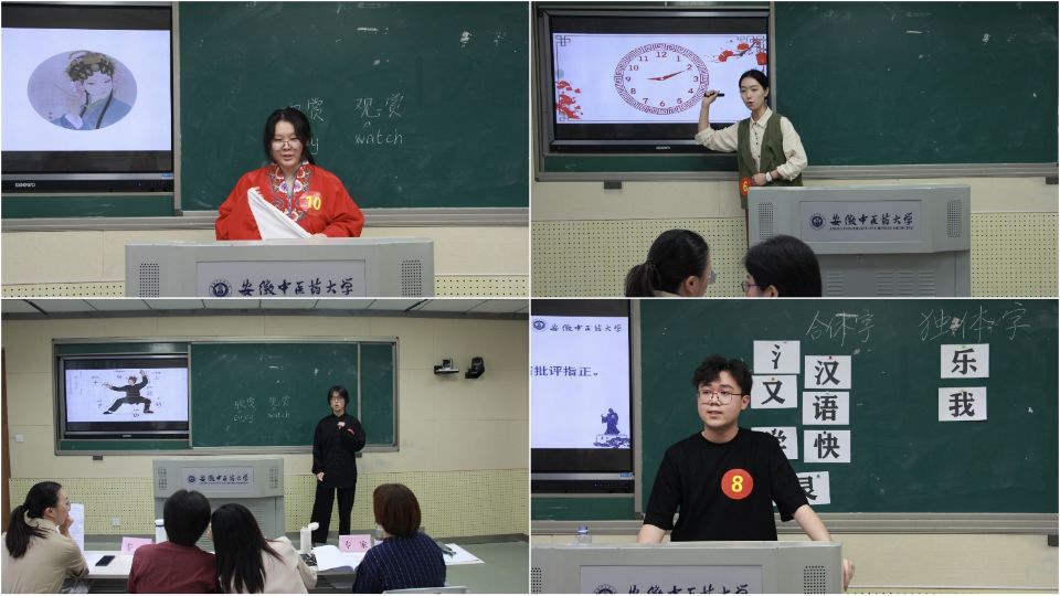 此次比赛共收到来自公司2019级、2020级、2021级汉语国际教育班共作品15件,讲授内容涉及中医词汇、养生文化、戏曲、语音教学、汉字教学、词汇教学、语法教学等诸多方面。各参赛选手经过赛前精心准备,通过课堂教学环节展示了教学基本功。经过激烈角逐,2020级汉语国际教育班苏宸铭和2019级汉语国际教育班陶韩宇获得一等奖,2019级汉语国际教育班金子荧、2020级汉语国际教育班梅萌萌、王姚琦、2021级汉语国际教育班陈正宇获得二等奖。他们将代表公司参加安徽省首届国际汉语教学微课大赛。
