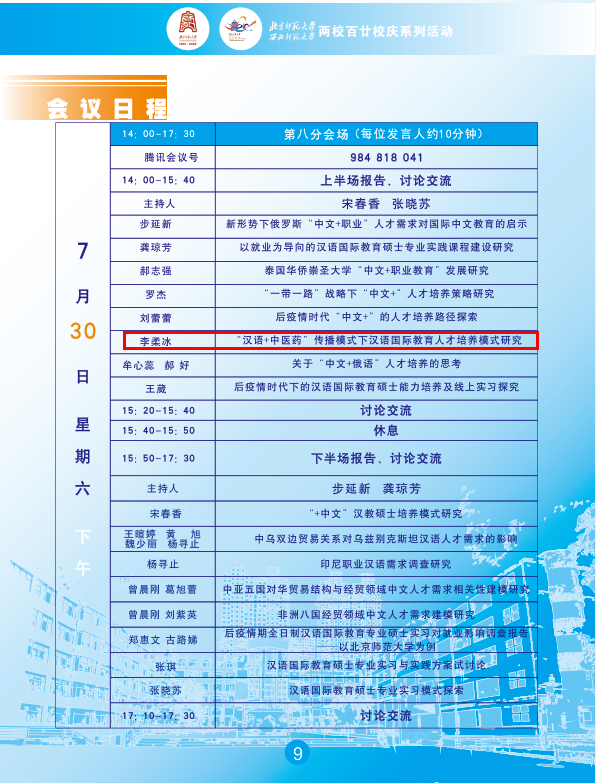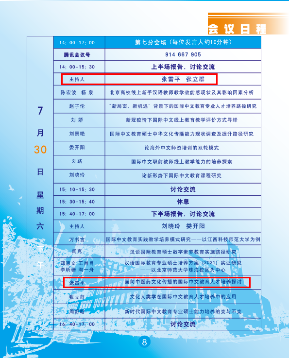 汉语国际教育系主任张雷平和教师李柔冰分别做题为《面向中医药文化传播的国际中文教育人才培养探讨》和《“汉语+中医药”传播模式下汉语国际教育人才培养模式研究》的小组发言。张雷平教授主持第七分会场,并在闭幕式对分会场研讨作了总结。
