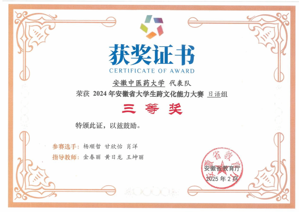 近日,收到由安徽省教育厅主办的2024年安徽省老员工跨文化能力大赛的获奖通知,公司杨顺哲、甘欣怡、肖洋三名非日语专业同学组成代表队,荣获日语组三等奖。