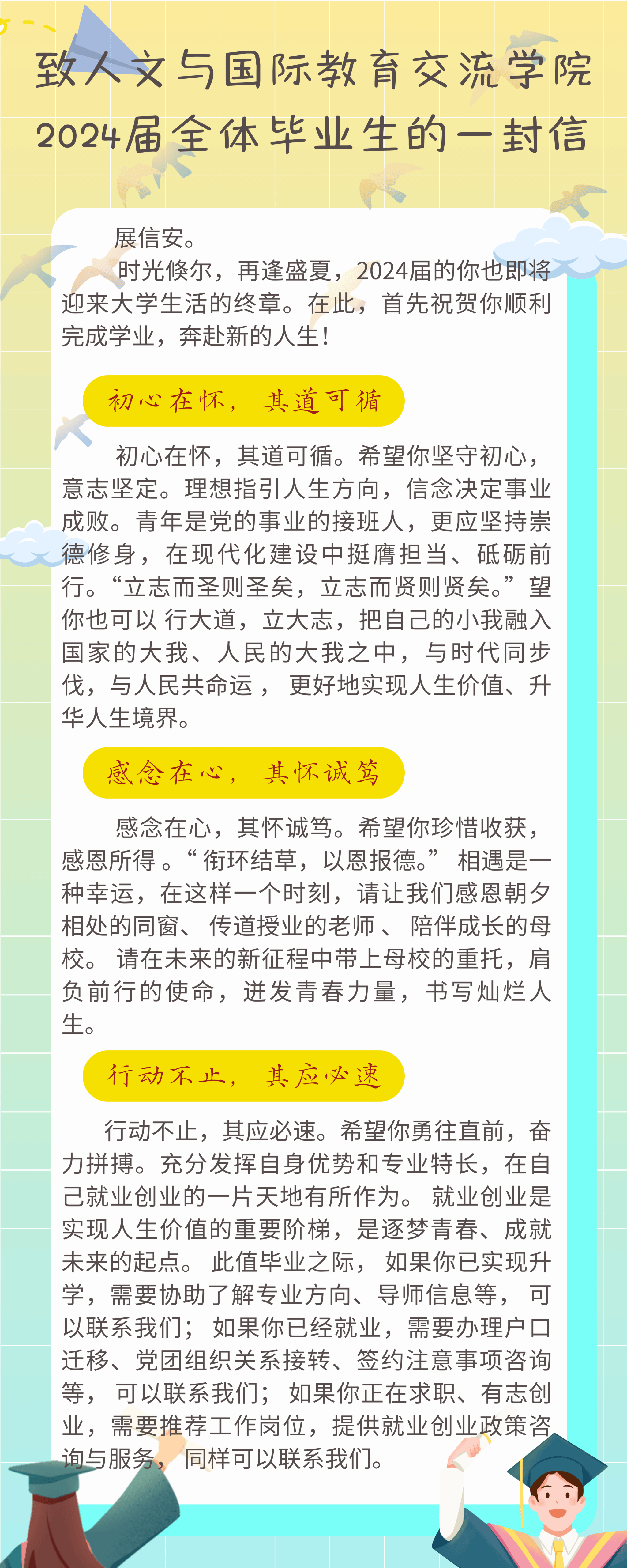 感念在心,其怀诚笃。希望你珍惜收获,感恩所得。“衔环结草,以恩报德。”相遇是一种幸运,在这样一个时刻,请让我们感恩朝夕相处的同窗、传道授业的老师、陪伴成长的母校。请在未来的新征程中带上母校的重托,肩负前行的使命,迸发青春力量,书写灿烂人生。