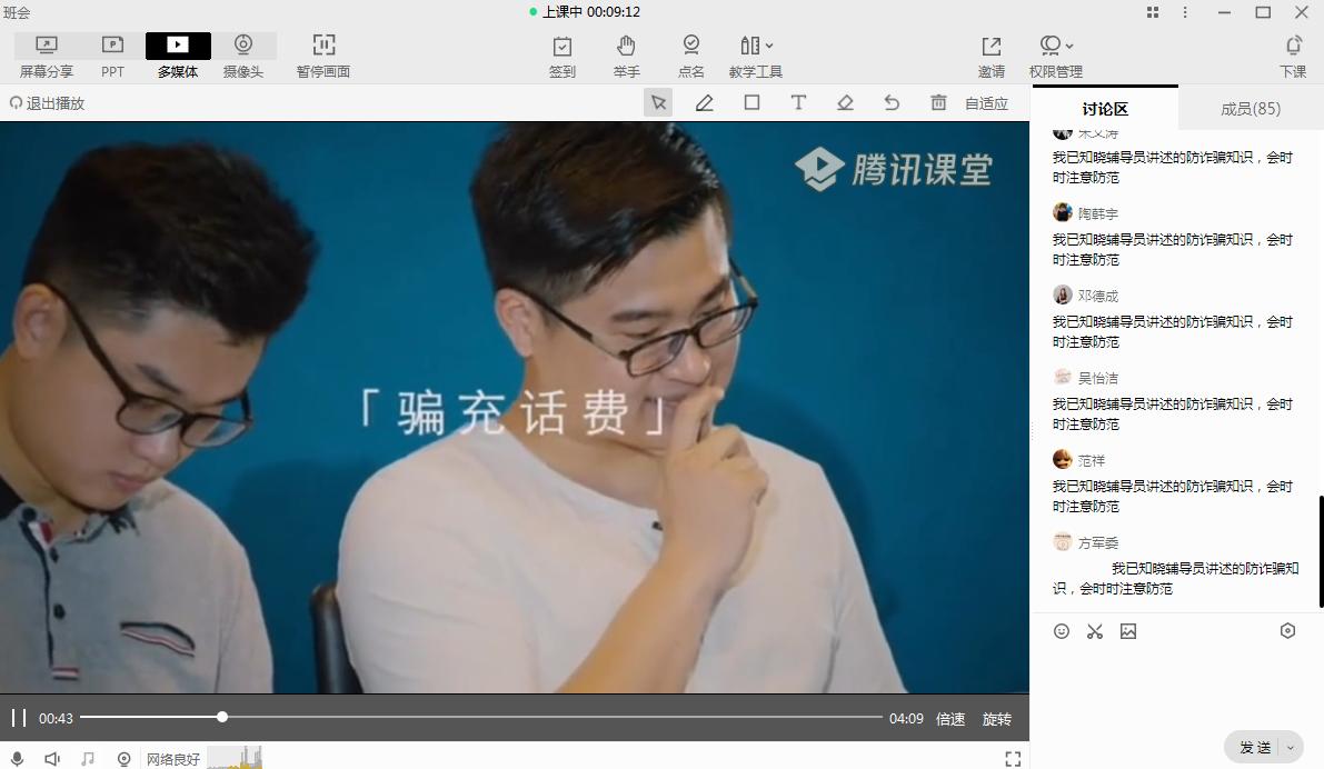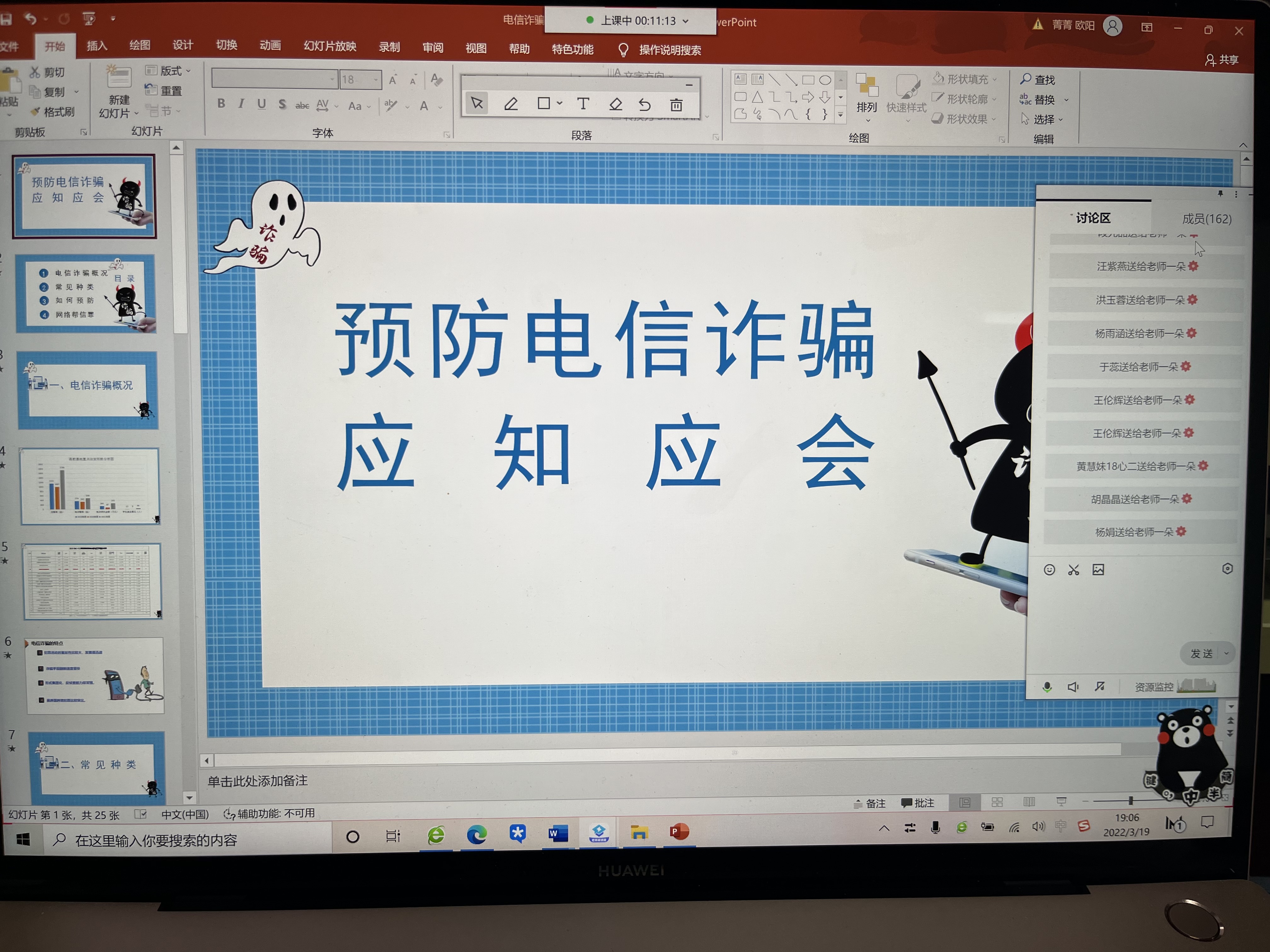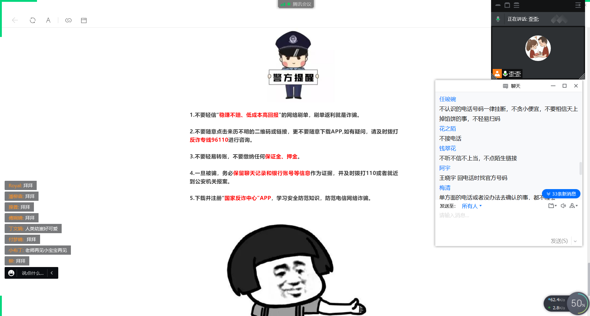 主题班会上,辅导员老师为同学们讲述了员工被骗的典型案例,列举了“兼职刷单”、“异性裸聊”、“冒充好友、快递员”、“注销贷款”等常见诈骗类型,深入剖析犯罪分子实施诈骗的详细过程和环节特点,提醒同学们注意诈骗手段的多样性和迷惑性,要时刻保持清醒的头脑,紧绷防范之弦,不轻信、不透露、不转账。