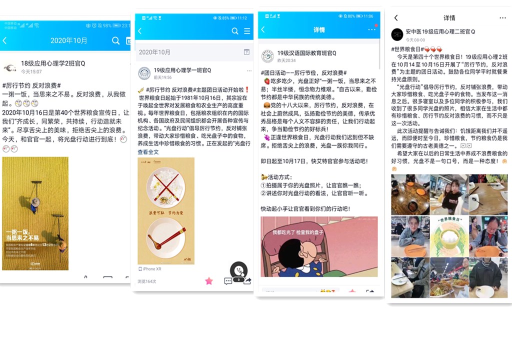 “民以食为天,粮以俭为先。”本次团日活动以班级团支部为主体组织单位,形式多样的宣传与活动随之展开。m88各团支部利用官方账号宣传世界粮食日的有关知识,倡导大家参与互动。公司学子积极响应,纷纷在社交平台晒出“光盘”照片,并在官方账号下留言,表达自己对于“节约粮食”和“光盘行动”的切实感悟。做到线上线下结合的同时,还有与光盘合影、自己制作主题海报和视频等多种活动形式的创新。