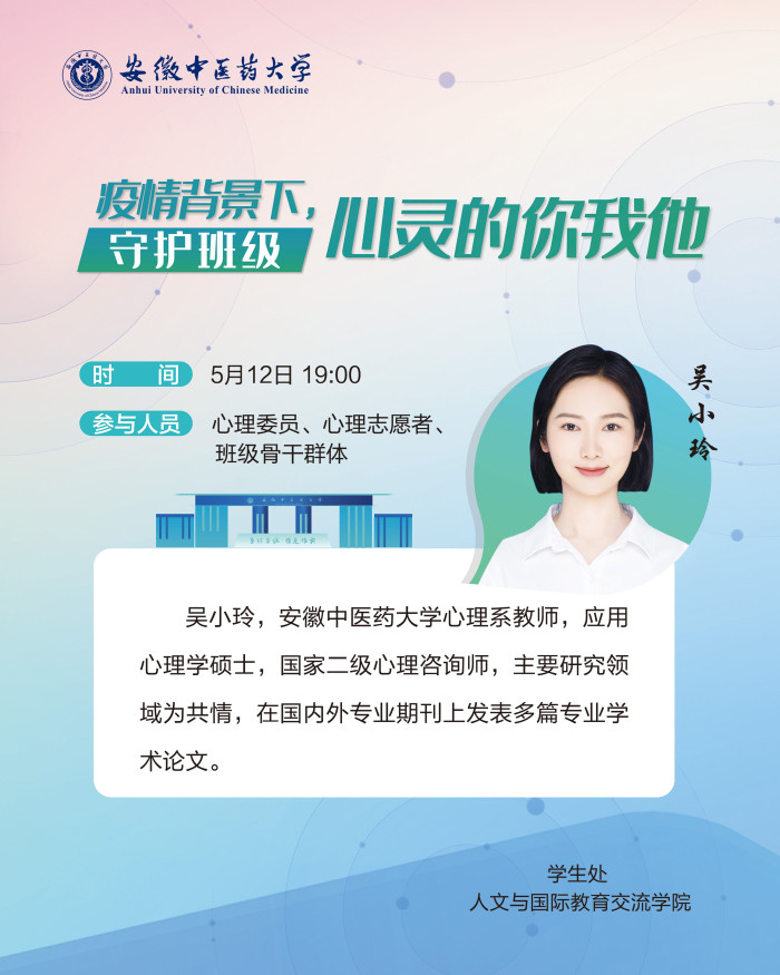 朋辈心理辅导员是心灵的守护者,是微笑的践行者,是冷静的观察者,是无私的帮助者,是聪明的引渡者。班级骨干、心理委员、寝室气象员等要发挥朋辈辅导的积极作用,帮助同学们在后疫情时期保持理性平和、积极乐观的心态。(胡霞、毛玉洁/文图 姚为久/审核)