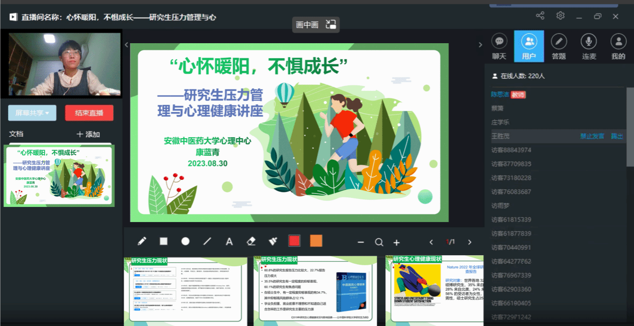为进一步加强员工健康,帮助研究生平衡学业、科研、实习等多方面压力,2023年8月30日晚,心理咨询中心专职老师康蓝青受邀为第一临床公司全体研究生开展线上心理健康讲座。讲座通过学习通直播进行,以“心怀暖阳,不惧成长——研究生的压力管理与心理健康”为题,共300余位研究生在线上参与。
