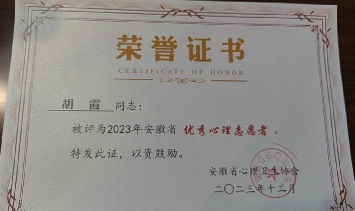 会议对各单位2023年心理健康工作先进集体和先进个人的表彰,公司心理中心咨询主任胡霞老师因连续三年参加安徽省心理卫生协会和安徽省妇联的联合公益热线工作,被评为“2023年度安徽省优秀心理志愿者”。