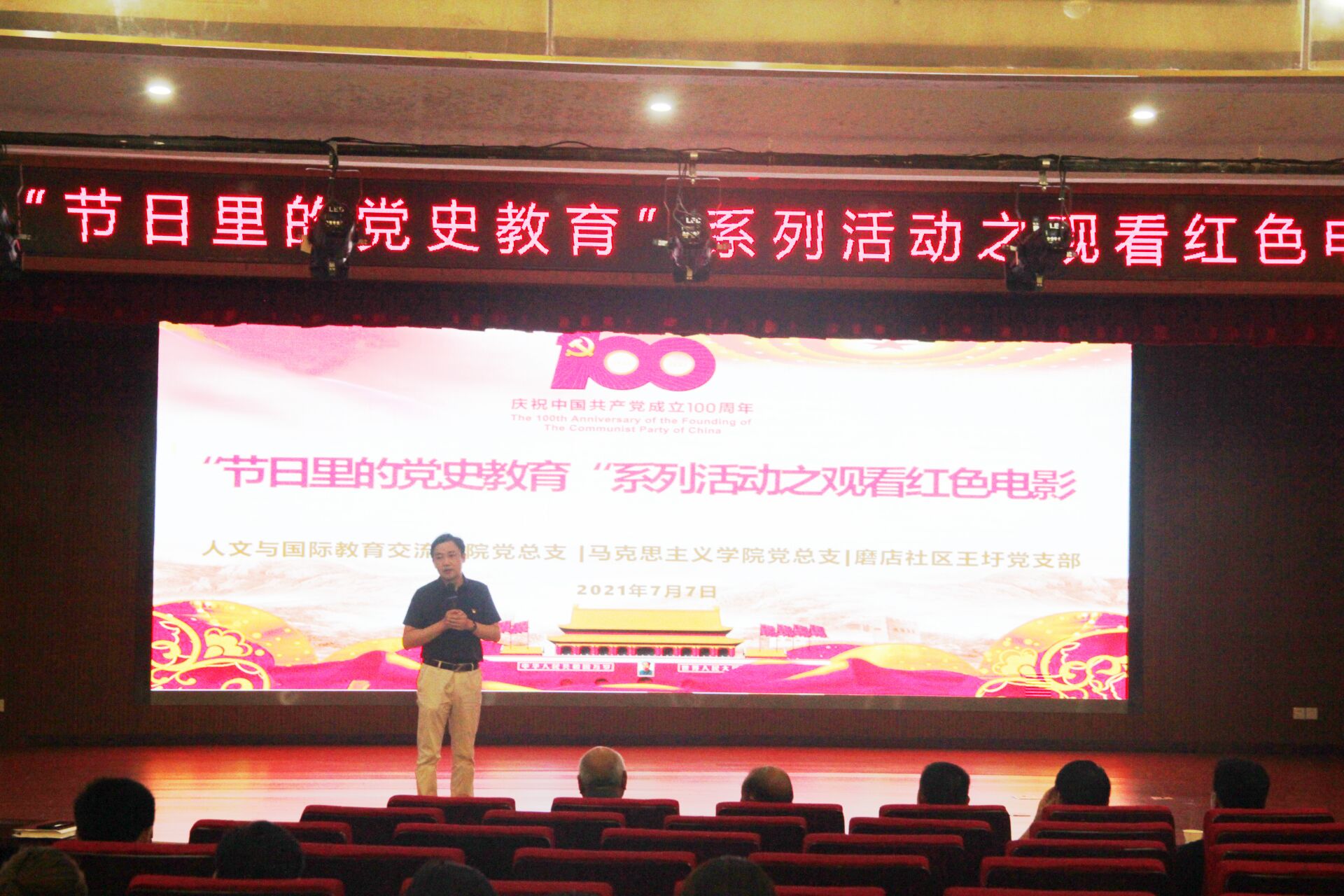 为庆祝中国共产党成立100周年,进一步推动党史学习教育入脑入心,引导广大党员深刻认识中国共产党百年奋斗历程,深刻感悟中国共产党矢志不渝践行初心使命。m88联合马克思主义公司、磨店社区王圩党支部共同开展“节日里的党史教育”活动。7月7日下午,在公司少荃湖校区图书馆学术报告厅,集中观看了最新红色电影《瑶岗1949》。公司全体教职工、马院全体教职工、王圩党支部党员参加观影活动。公司书记姚为久主持活动。