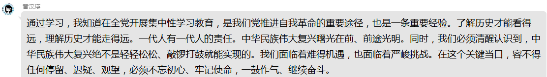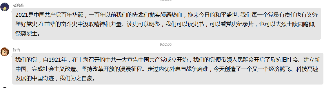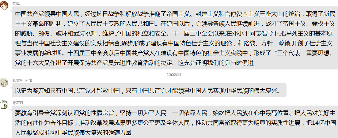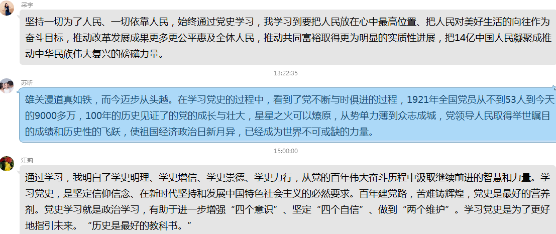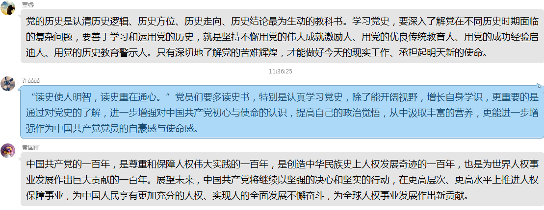 4月10日教工一支部党员通过开展“党史学习教育:为什么学、怎么学、学什么”线上学习活动,并作交流讨论。党员们纷纷表示将“学史明理、学史增信、学史崇德、学史力行”的目标要求贯穿学习的始终,要通过学习党史坚定信仰信念,并认为以史为鉴方知只有中国共产党才能救中国,只有中国共产党才能领导中国人民实现中华民族的伟大复兴。