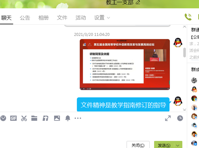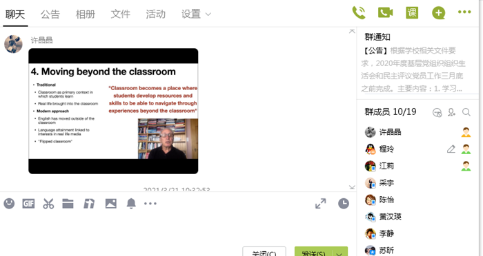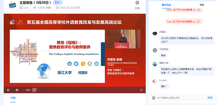3月20日至21日,教工一支部组织外语系及传播系全体外语教师线上参加由主办的“第五届全国高等公司外语教育改革与发展高端论坛”。该论坛大咖云集,围绕“铸教、铸人、铸魂”主题展开,内容丰富,既有新的《大学英语教学指南》的说明,也有思政进课堂的专题讲座;既有国内外专家的线上线下主题讲座,也有分论坛的全国高校教师的思想碰撞。整个论坛最高峰期间,在线人数达到13.5万,给全体外语教师的周末加了一个精神大餐。全体英语老师及教工一支部党员积极参与,并在交流群众进行交流。