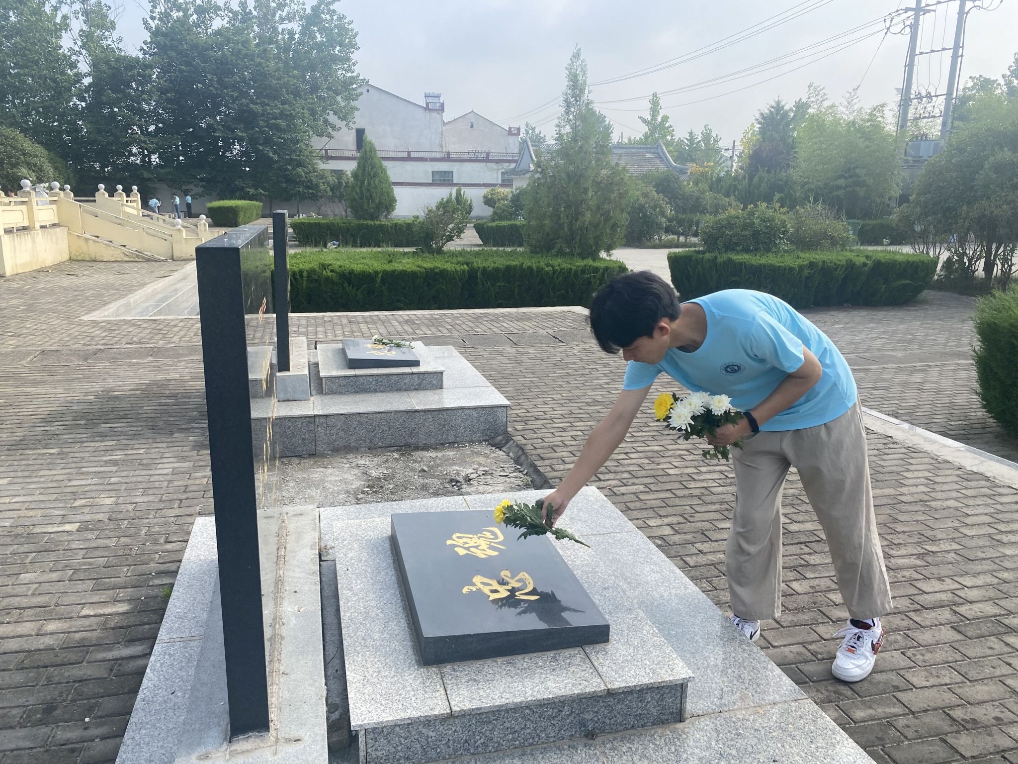 在程庙村烈士陵园中,同学们来到纪念碑前,在员工第一党支部书记欧阳菁菁的带领下,在鲜红的党旗下,新党员庄严宣誓、老党员重温入党誓词。随后师生党员逐一献上鲜花,默哀一分钟,向烈士寄托哀思。