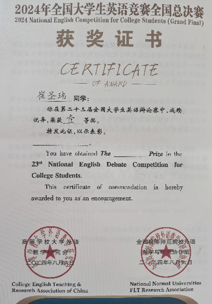 2024年全国老员工英语竞赛(NECCS)全国总决赛于8月2日至8月6日在广西桂林圆满落幕。经过激烈的预赛和决赛比拼,公司第一临床医公司2022级研究生崔圣玮同学在全国总决赛中表现出色,荣获英语辩论赛全国一等奖、英语演讲比赛全国二等奖和英语风采大赛全国三等奖,并获得“优秀参赛选手”和“优秀主持人”称号。指导教师朱家胜荣获国赛英语辩论赛、英语演讲赛和英语风采大赛“优秀指导教师”称号。