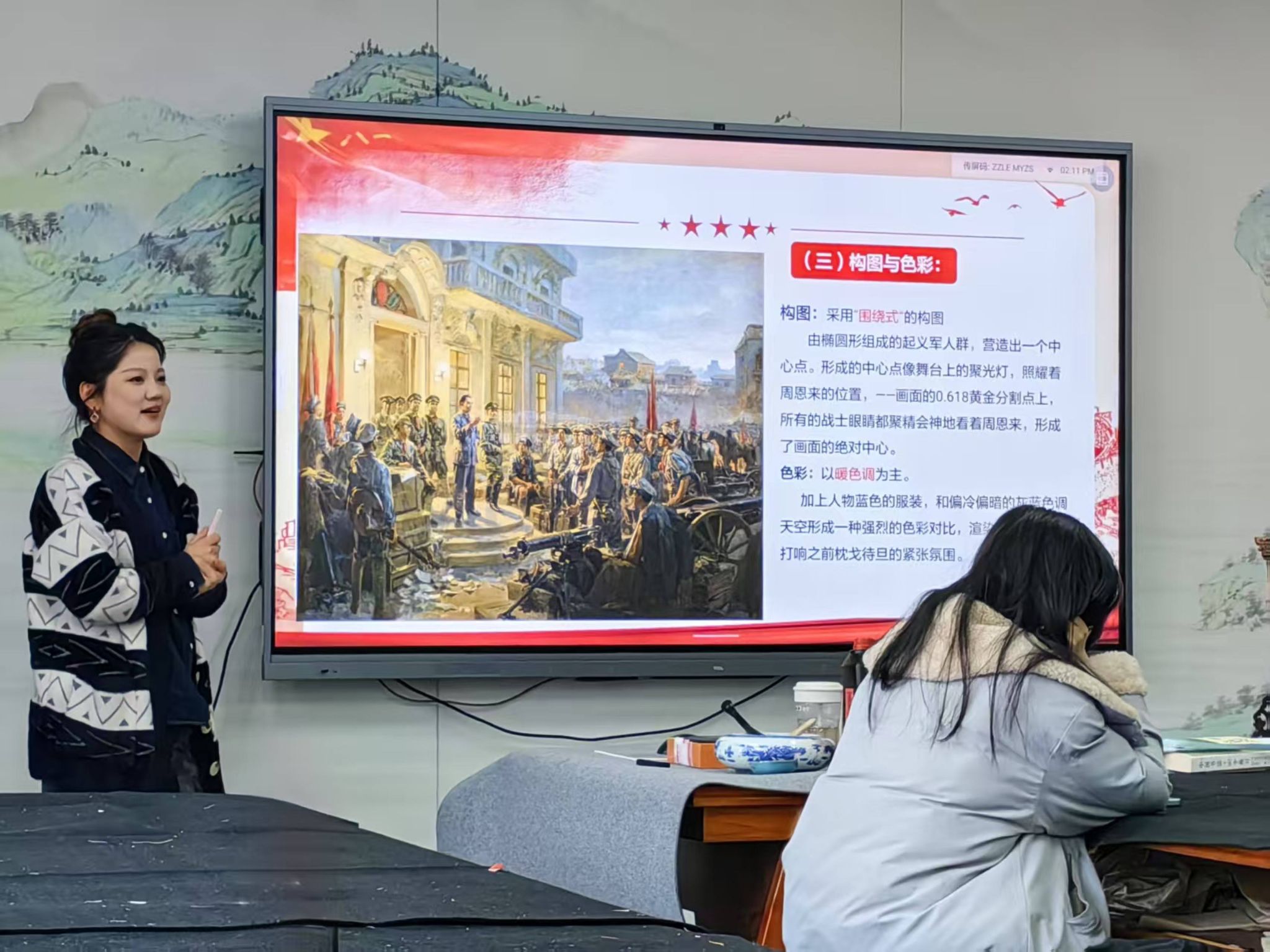 本次党课以“以美育人、以文化人”为主线,卞修婉通过深度剖析历史事件与经典名画的构造、色彩及文化内涵,为现场师生呈现了一场思想与艺术交融的视听盛宴。结合了文艺复兴、中国近现代革命等重大历史事件,解析了艺术创作与时代精神的关联。通过对比黎冰鸿《南昌起义》中光影与构图的象征意义,她指出:“艺术不仅是审美的载体,更是时代精神的镜像”,鼓励与会师生在日常生活中发现美、创造美、传播美。