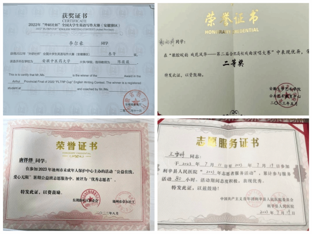 团支部每一名成员在完成专业课程学习的基础上,积极参加各类学科知识竞赛、才艺技能比赛等,同学们在丰富多彩的文化艺术活动中充分发挥自我潜能,提高自身的综合素质。该团支部成员在公司、公司组织的各级各类比赛活动中取得了优异成绩。班级同学累计获得省级奖项三项,市级荣誉五项,校级院级荣誉40余项。其中李尔豪同学获得全国A类赛事“外研社·国才杯”英语挑战赛安徽省三等奖,谢雨婷获得了第二届合肥高校戏曲演唱大赛二等奖。