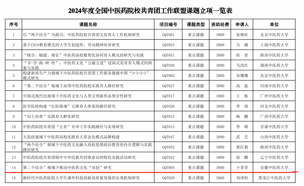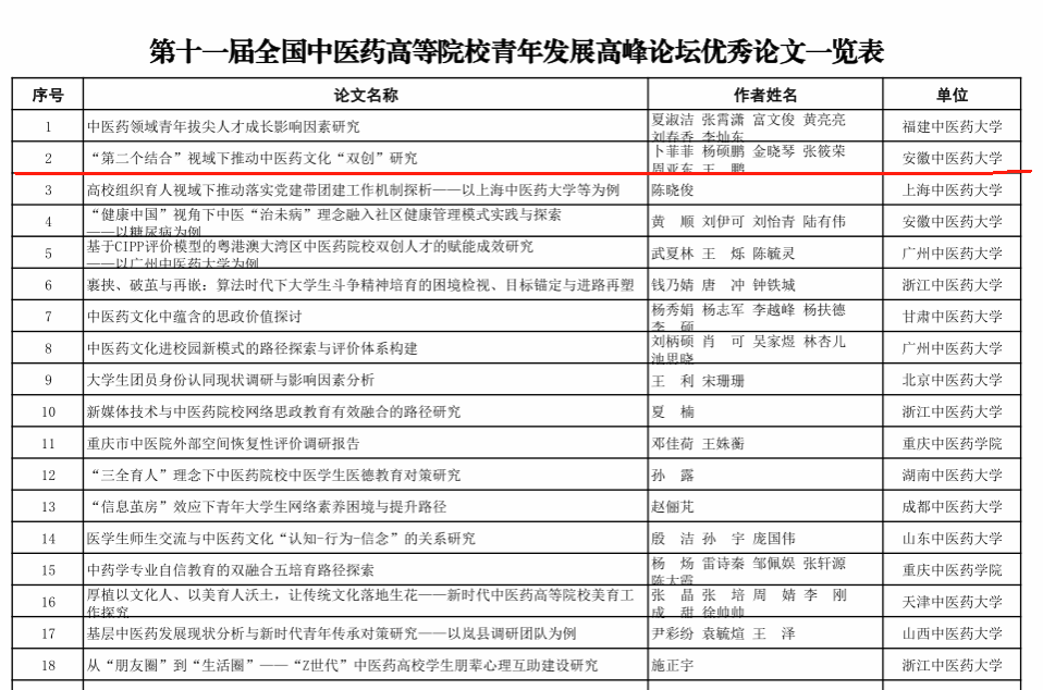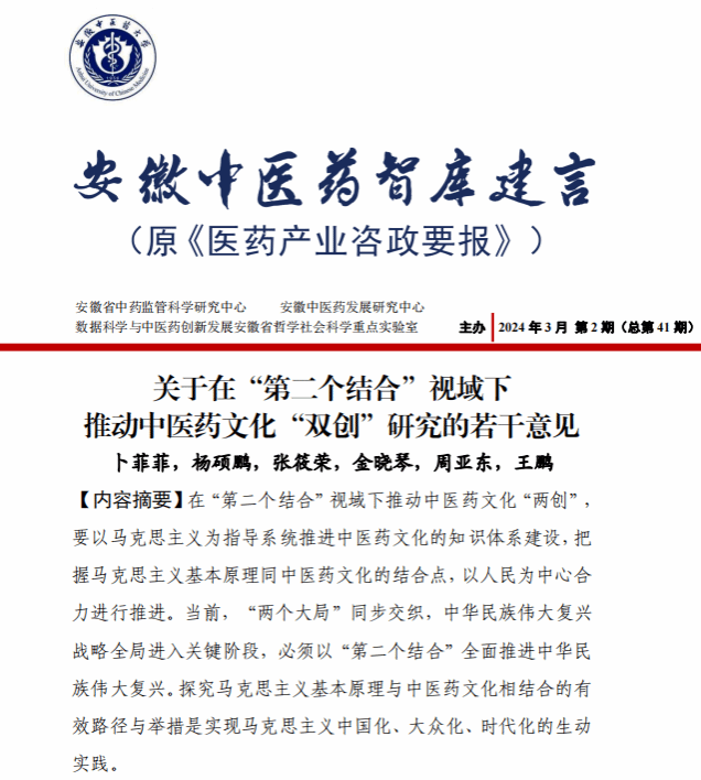 为进一步推动马克思主义基本原理同中国具体实际相结合、同中华优秀传统文化相结合,弘扬中华优秀传统文化,深入中医药文化创造性转化与创新性发展研究工作。近日,在团中央基层建设部的指导下,全国中医药院校共青团工作联盟组织开展2024年度共青团工作研究课题申报及青年发展高峰论坛征文工作。公司青年教师卜菲菲牵头申报课题 《“第二个结合”视域下推动中医药文化“双创”研究》获重点课题立项,撰写论文《“第二个结合”视域下推动中医药文化“双创”研究》获评优秀论文,撰写《关于在“第二个结合”视域下推动中医药文化“双创”研究的若干意见》发表在安徽中医药智库建言(原《医药产业咨政要报》)。