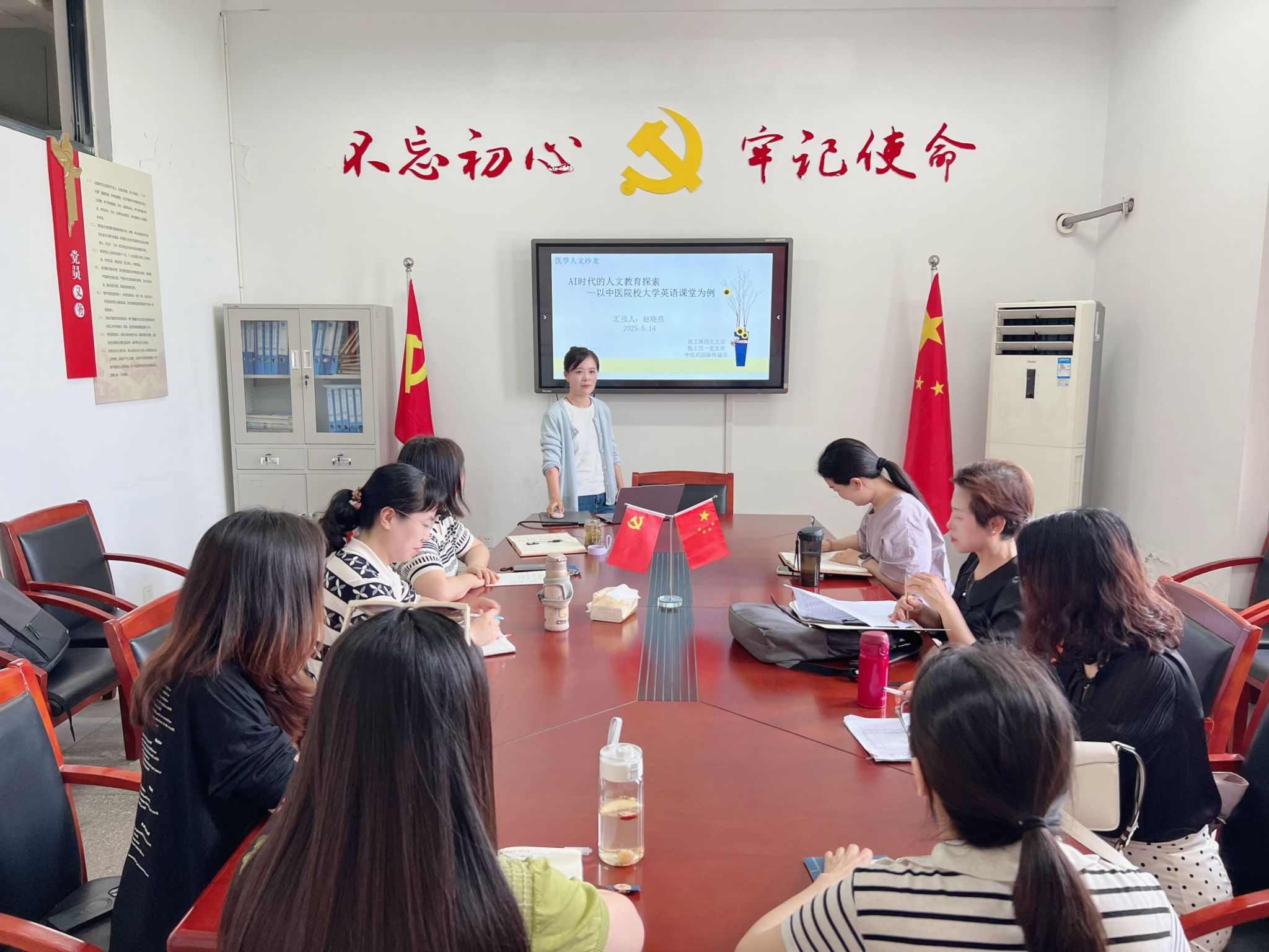 5月14日上午,公司举办第七十一期学术沙龙。本次学术沙龙的主题为“AI时代的人文教育探索—以中医院校大学英语课堂为例”,由外语教师赵晓燕主讲,外语系和中医药国际传播系部分教师参加了此次沙龙活动。 讲座伊始,赵老师从m88官网校徽的文化意蕴切入,介绍了古希腊的医疗之神Asclepius和他手中的蛇杖等象征符号;结合中国神话中的女娲、盘古、伏羲等文化主题,引出中医体系中的药用蛇蜕、蛇胆、蛇毒等。