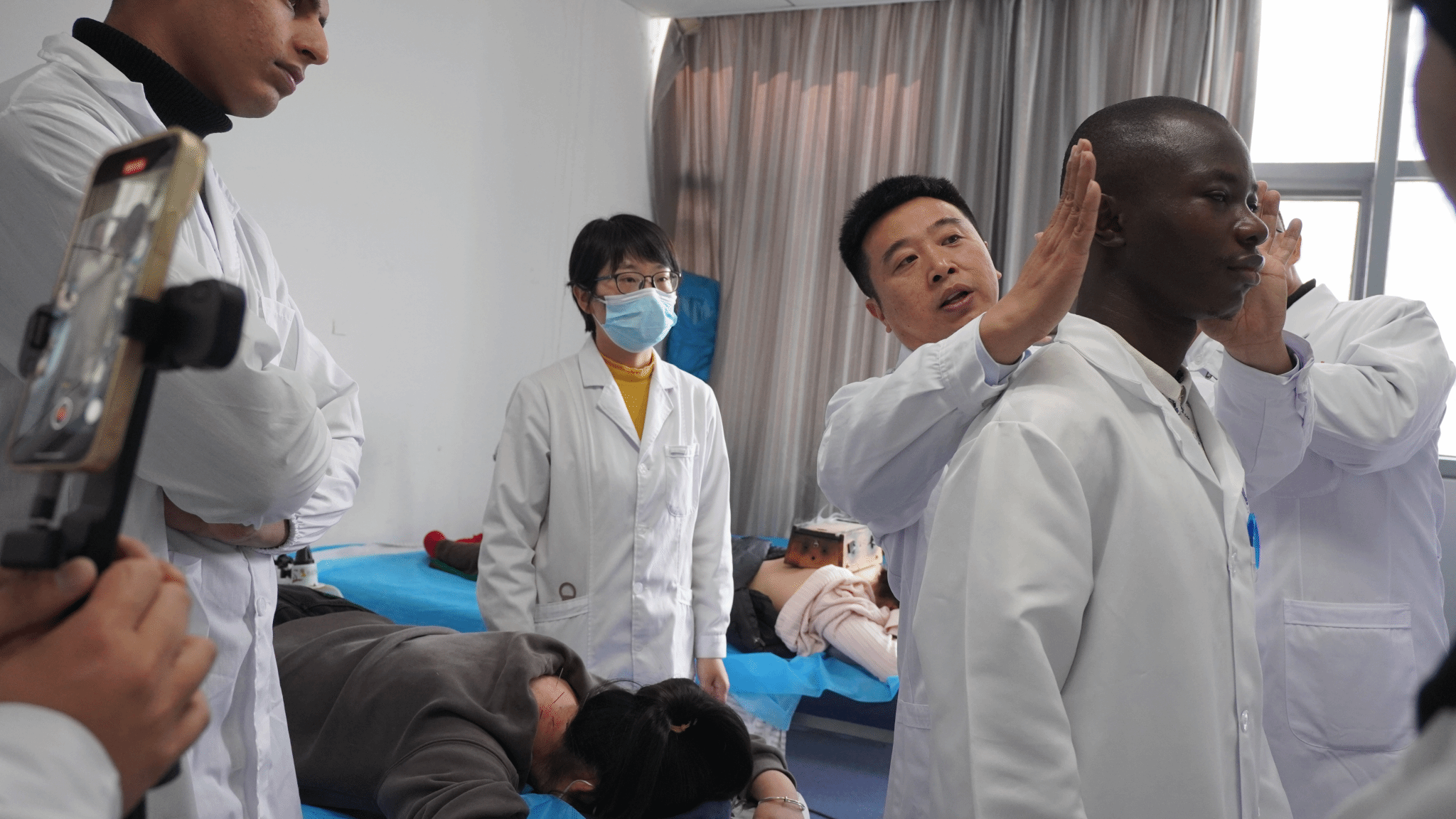 随后,同学们在医院老师的带领下参观了医院针灸推拿科、康复治疗科诊疗区域,详细了解了科室布局与特色诊疗设备。潘银星结合典型病例,以中英双语详细讲解了针灸在治疗颈椎病、腰痛等常见疾病中的应用,重点演示了后溪穴、委中穴及腰痛点穴的定位与操作技巧,深入浅出地阐释了“选穴原则”与穴位配伍的精妙。