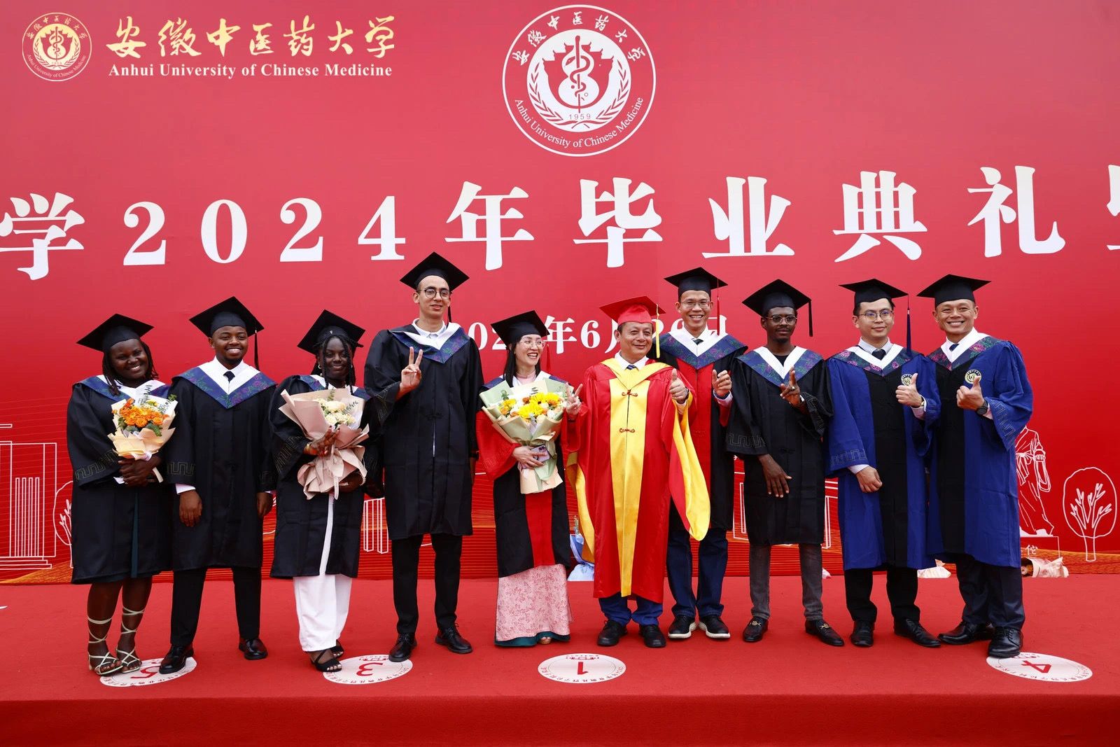 在学位授予仪式环节,许钒董事长亲自为9名外国职工毕业生代表拨穗并合影留念,他向职工毕业生们表示热烈的祝贺,并勉励他们继续学习好中文和中医药学专业知识,做好中外友好交流的使者,在更多平台传播中医药文化,传播中国声音。