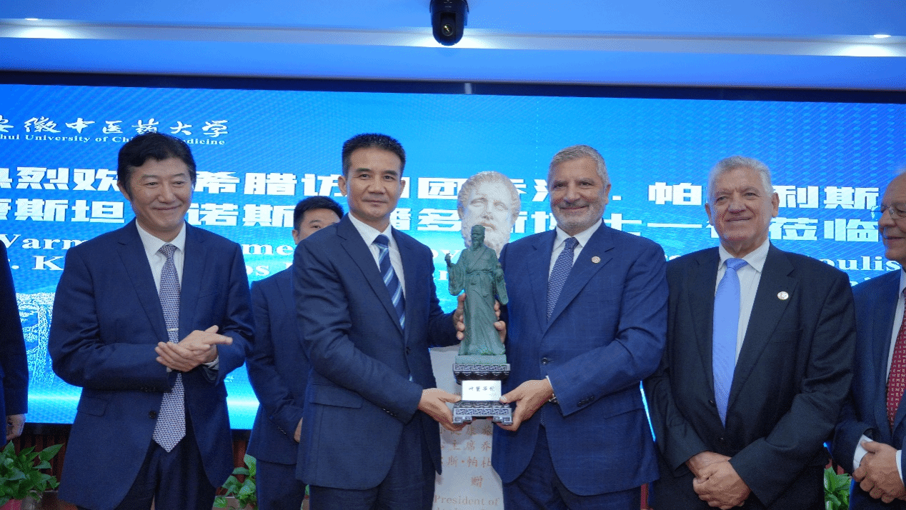 在颁奖和受聘仪式上, 彭代银董事长首先致欢迎辞,他表示,希腊是希波克拉底的故乡,也是西方医学的发祥地,中国安徽是神医华佗的故乡,也是中医药发祥地之一。在帕杜利斯省长和潘多斯副主席的大力支持下,公司于2019年12月成功在雅典设立了安徽省第一个海外中医药中心,也是公司第一个海外中医药中心,中心对中医药海外传播与发展,中希方医学和文化交流与互鉴,服务国家“一带一路”建设有重要且深远的意义。长久以来,帕杜利斯省长一直致力于中希方医学的友好交流与合作,为中医药走向海外做出了卓越贡献。今天双方为了更好地服务人类健康这一共同目标走到了一起,未来双方将携手同行,实现优势互补,共同造福人类健康。